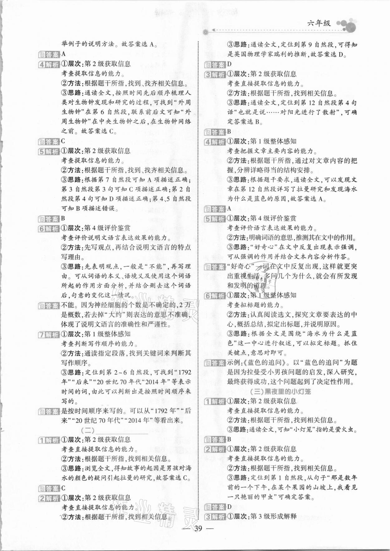 注:目前有些书本章节名称可能整理的还不是很完善,但都是按照顺序排列的,请同学们按照顺序仔细查找。练习册 2021年全优阅读派六年级B版人教版福建专版 答案主要是用来给同学们做完题方便对答案用的,请勿直接抄袭。