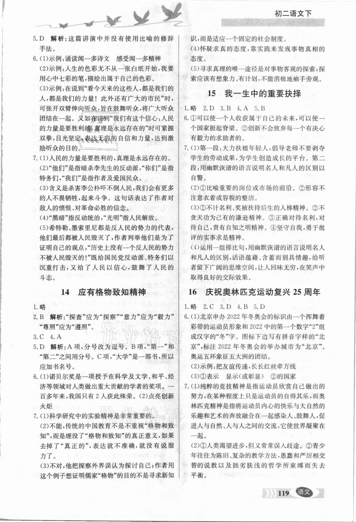 注:目前有些书本章节名称可能整理的还不是很完善,但都是按照顺序排列的,请同学们按照顺序仔细查找。练习册 2021年同步检测三级跳初二语文下册人教版 答案主要是用来给同学们做完题方便对答案用的,请勿直接抄袭。