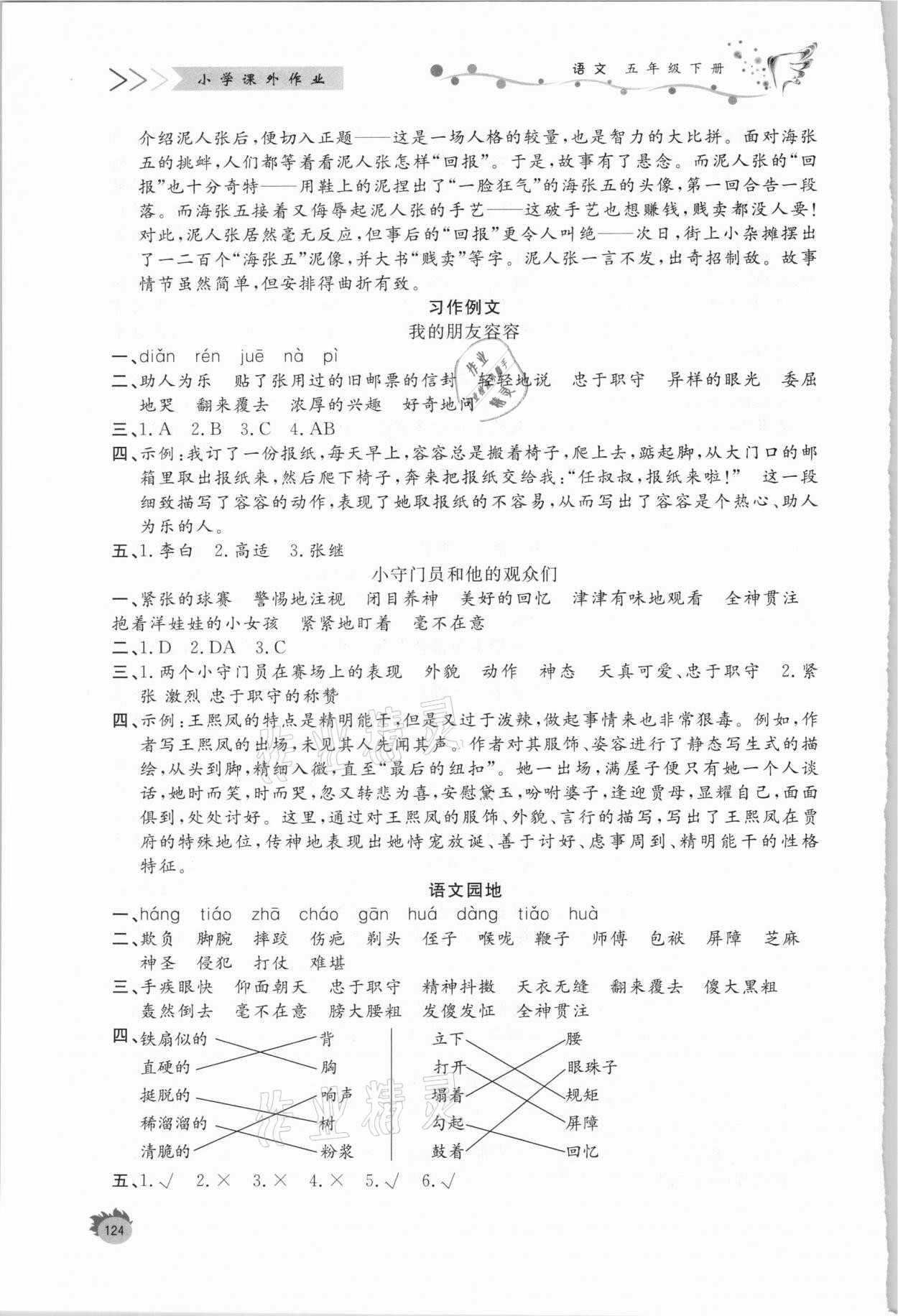 注:目前有些书本章节名称可能整理的还不是很完善,但都是按照顺序排列的,请同学们按照顺序仔细查找。练习册 2021年小学课外作业五年级语文下册人教版 答案主要是用来给同学们做完题方便对答案用的,请勿直接抄袭。