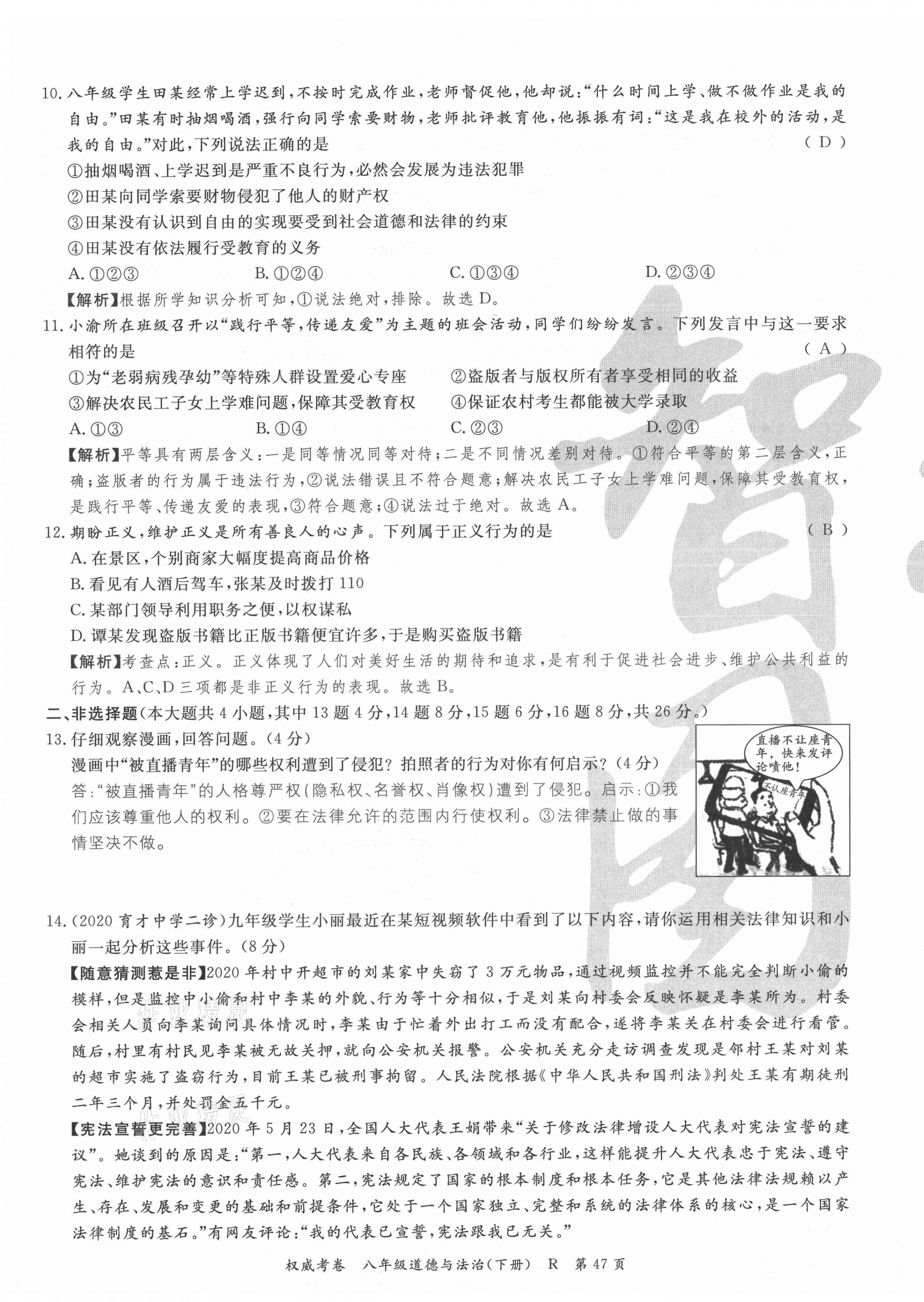 注:目前有些书本章节名称可能整理的还不是很完善,但都是按照顺序排列的,请同学们按照顺序仔细查找。练习册 2021年权威考卷八年级道德与法治下册人教版 答案主要是用来给同学们做完题方便对答案用的,请勿直接抄袭。