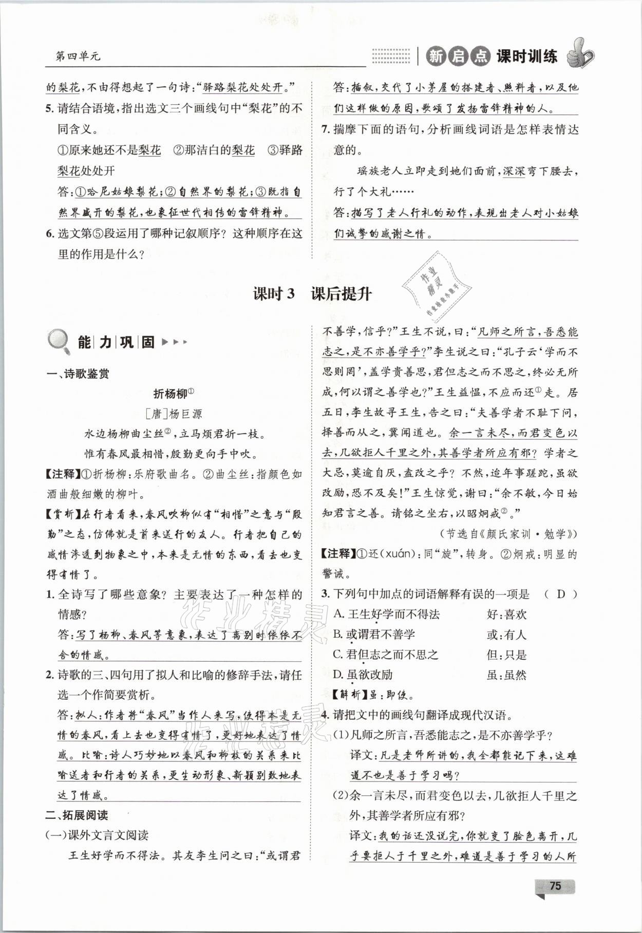 注:目前有些书本章节名称可能整理的还不是很完善,但都是按照顺序排列的,请同学们按照顺序仔细查找。练习册 2021年新启点课时训练七年级语文下册人教版 答案主要是用来给同学们做完题方便对答案用的,请勿直接抄袭。