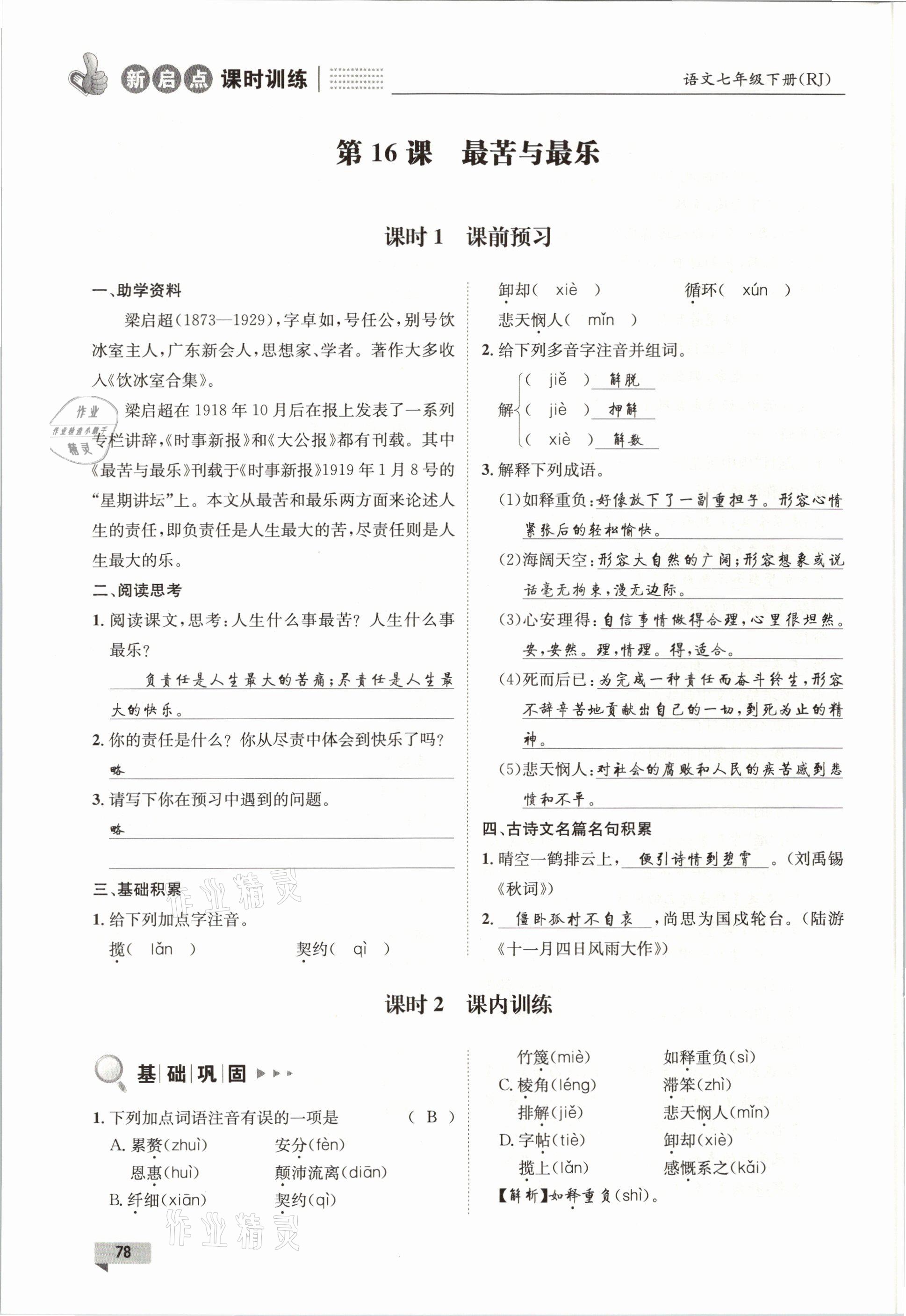注:目前有些书本章节名称可能整理的还不是很完善,但都是按照顺序排列的,请同学们按照顺序仔细查找。练习册 2021年新启点课时训练七年级语文下册人教版 答案主要是用来给同学们做完题方便对答案用的,请勿直接抄袭。