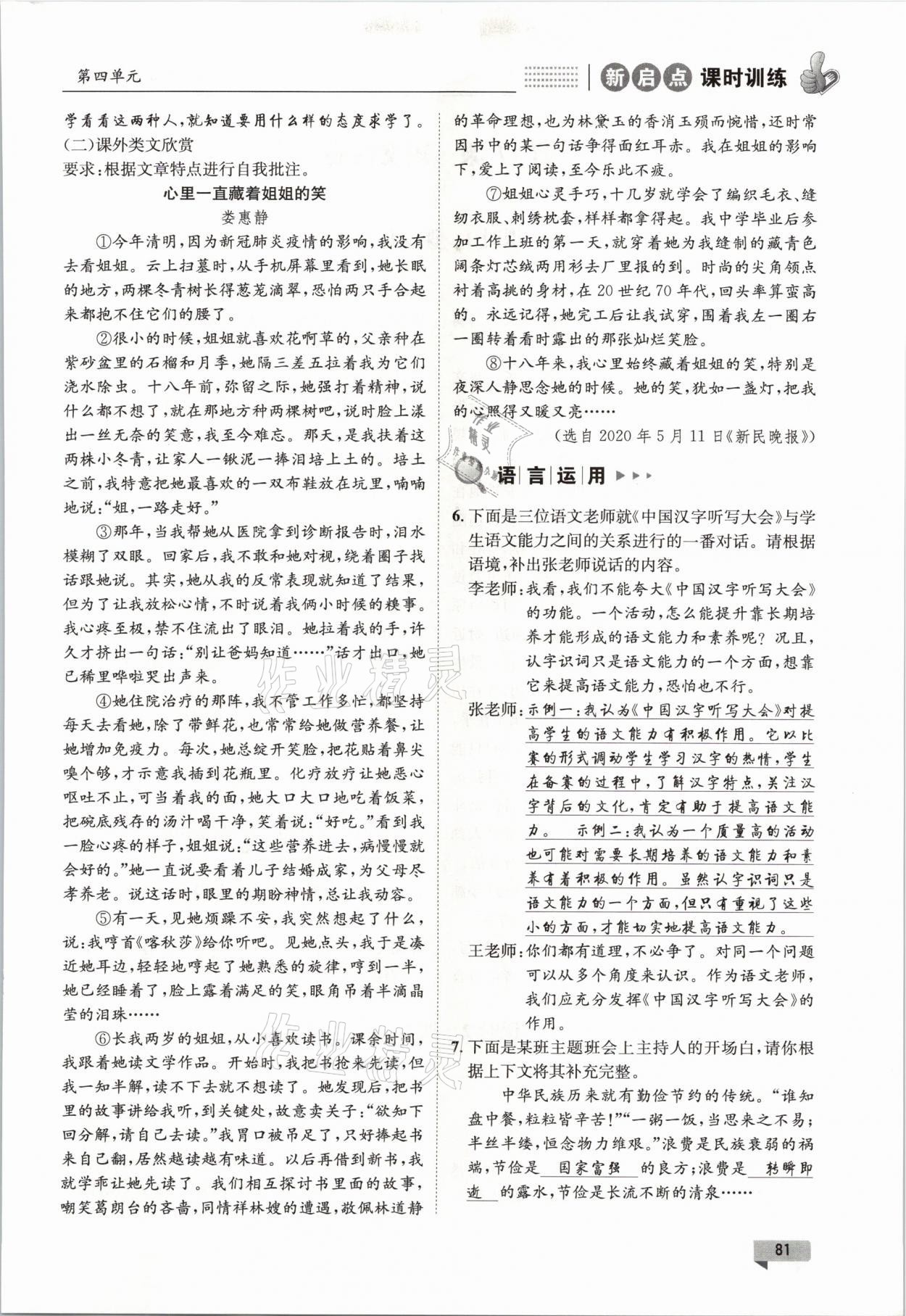 注:目前有些书本章节名称可能整理的还不是很完善,但都是按照顺序排列的,请同学们按照顺序仔细查找。练习册 2021年新启点课时训练七年级语文下册人教版 答案主要是用来给同学们做完题方便对答案用的,请勿直接抄袭。