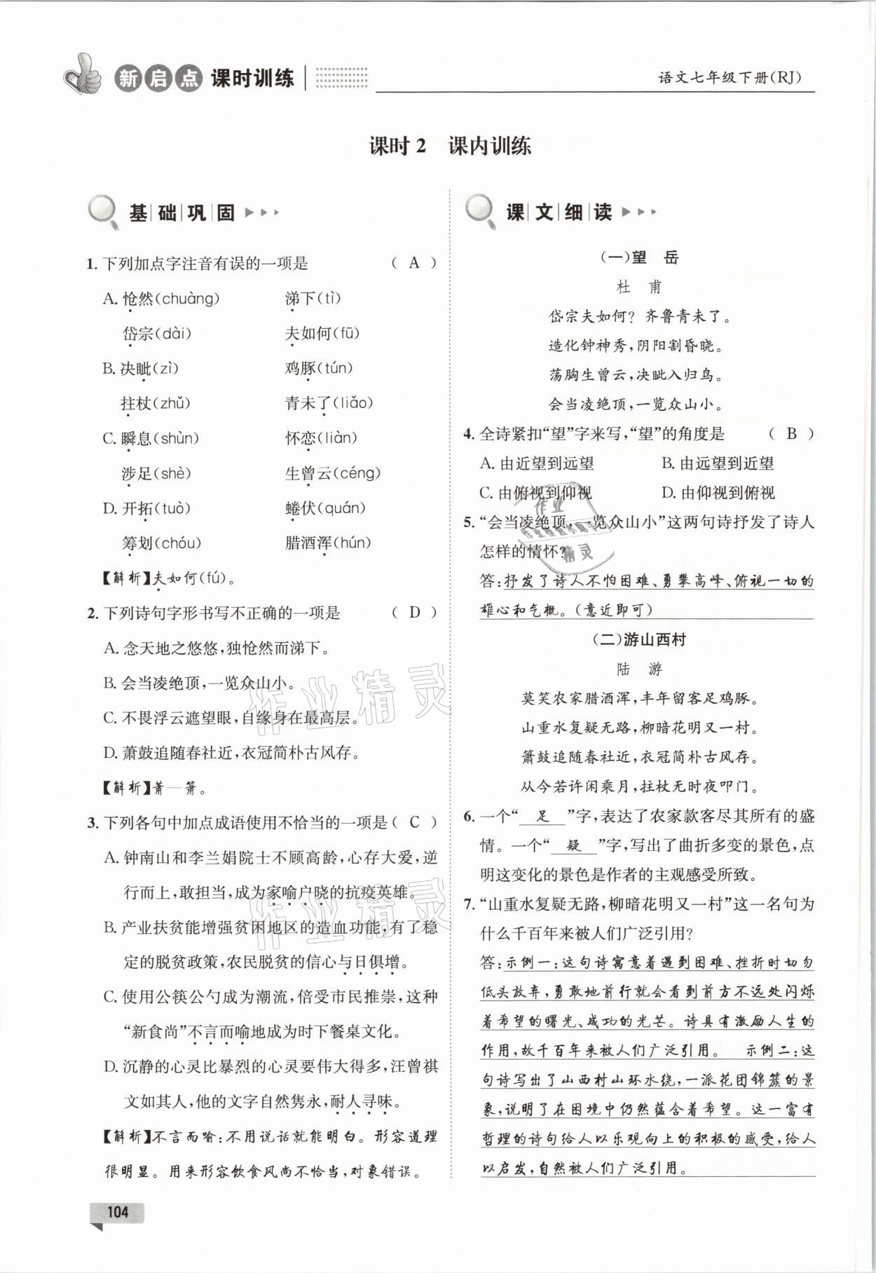 注:目前有些书本章节名称可能整理的还不是很完善,但都是按照顺序排列的,请同学们按照顺序仔细查找。练习册 2021年新启点课时训练七年级语文下册人教版 答案主要是用来给同学们做完题方便对答案用的,请勿直接抄袭。