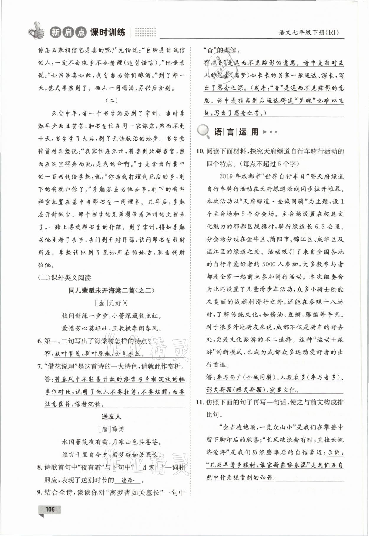 注:目前有些书本章节名称可能整理的还不是很完善,但都是按照顺序排列的,请同学们按照顺序仔细查找。练习册 2021年新启点课时训练七年级语文下册人教版 答案主要是用来给同学们做完题方便对答案用的,请勿直接抄袭。