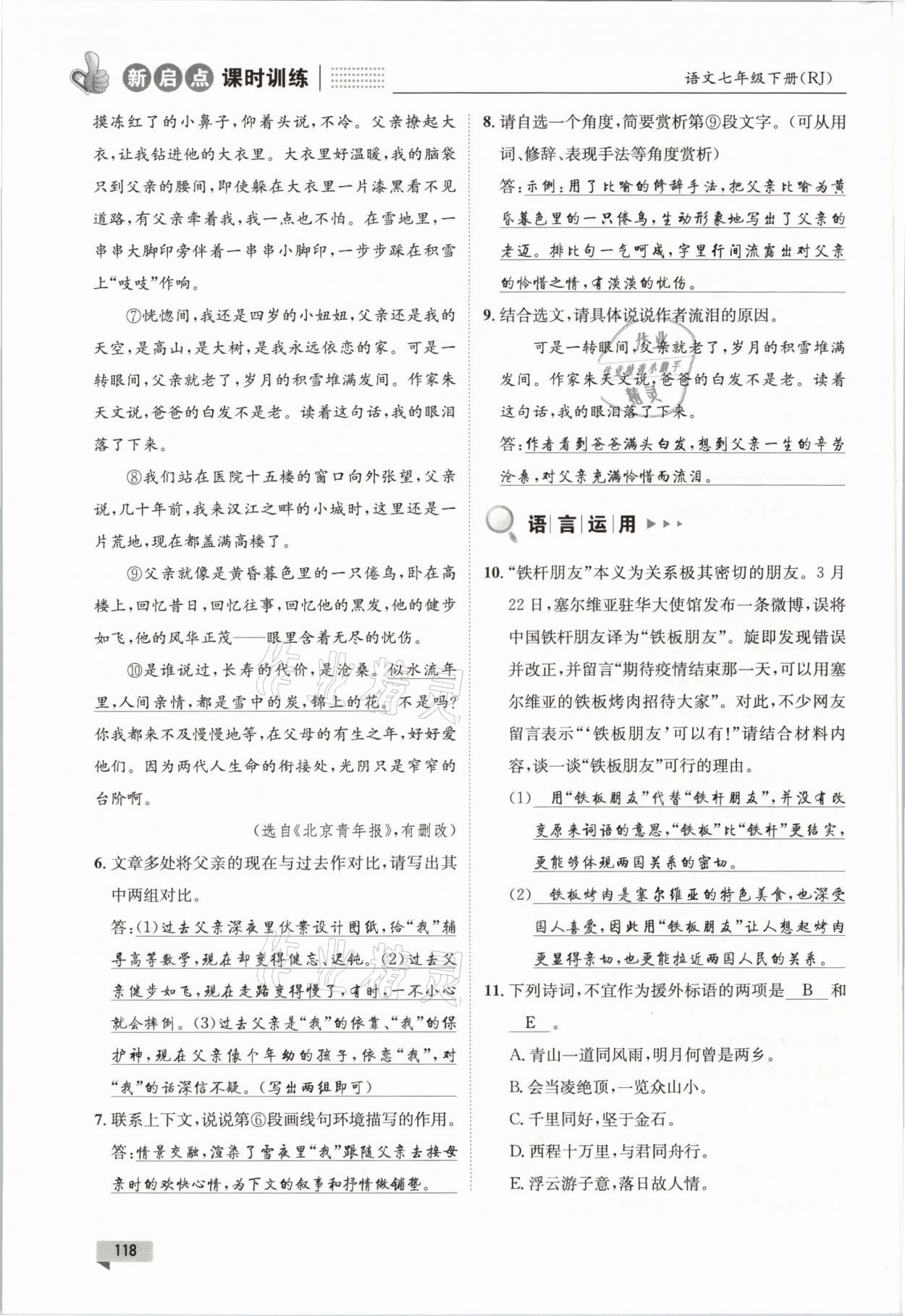 注:目前有些书本章节名称可能整理的还不是很完善,但都是按照顺序排列的,请同学们按照顺序仔细查找。练习册 2021年新启点课时训练七年级语文下册人教版 答案主要是用来给同学们做完题方便对答案用的,请勿直接抄袭。