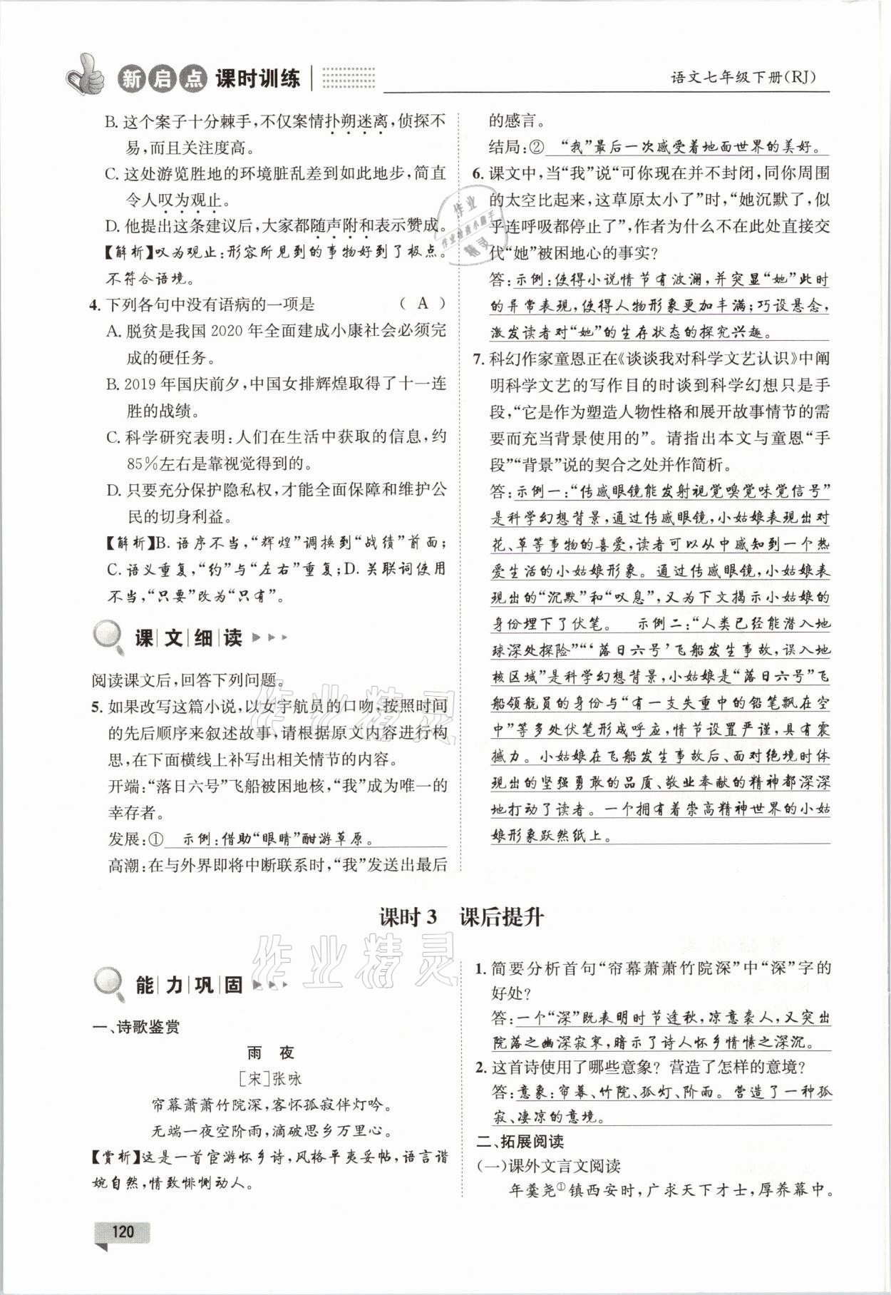 注:目前有些书本章节名称可能整理的还不是很完善,但都是按照顺序排列的,请同学们按照顺序仔细查找。练习册 2021年新启点课时训练七年级语文下册人教版 答案主要是用来给同学们做完题方便对答案用的,请勿直接抄袭。