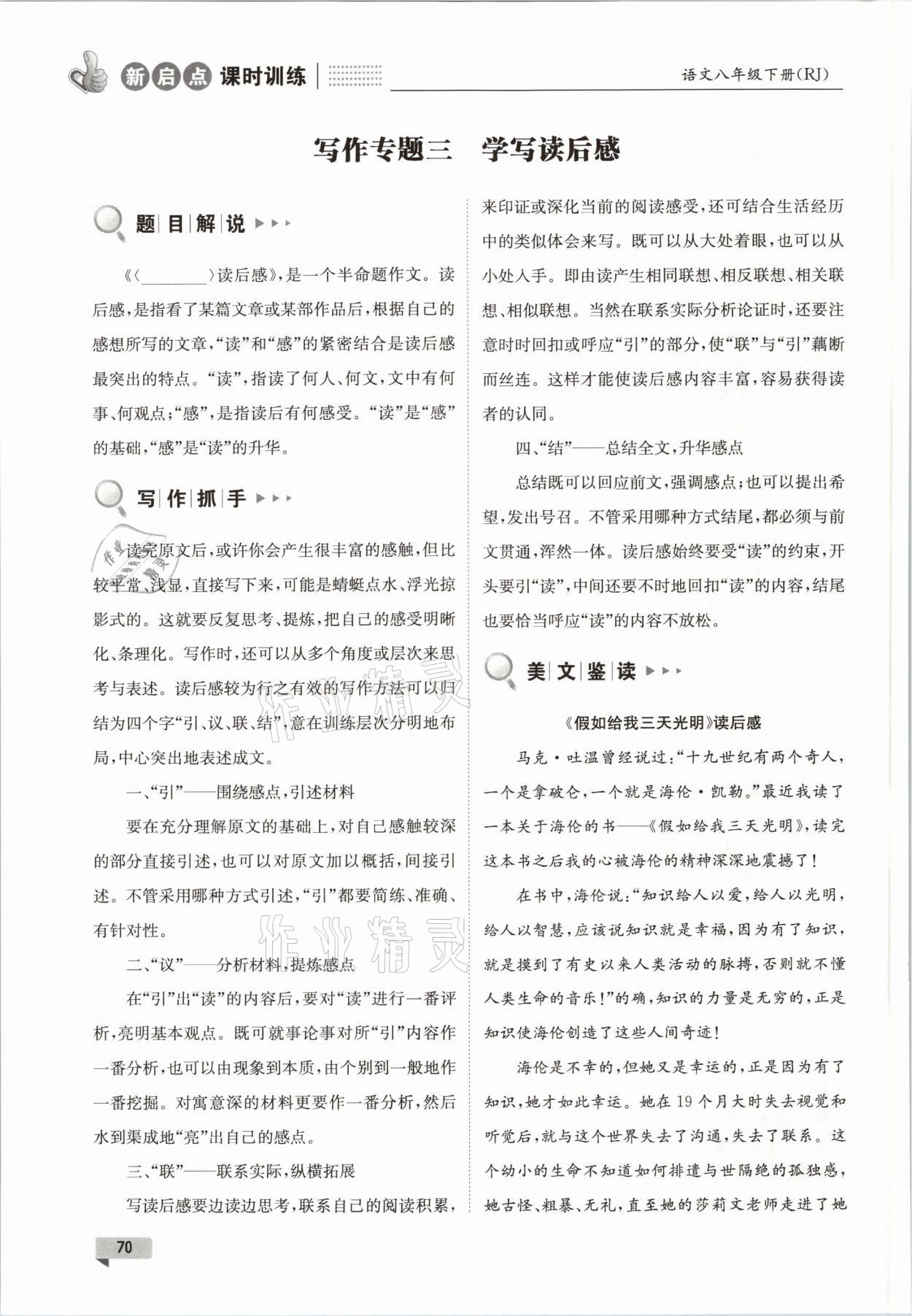 注:目前有些书本章节名称可能整理的还不是很完善,但都是按照顺序排列的,请同学们按照顺序仔细查找。练习册 2021年新启点课时训练八年级语文下册人教版 答案主要是用来给同学们做完题方便对答案用的,请勿直接抄袭。