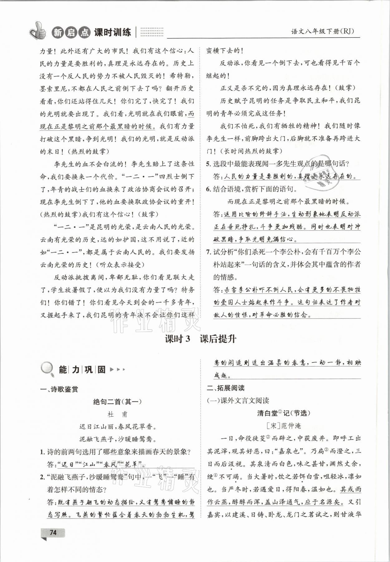 注:目前有些书本章节名称可能整理的还不是很完善,但都是按照顺序排列的,请同学们按照顺序仔细查找。练习册 2021年新启点课时训练八年级语文下册人教版 答案主要是用来给同学们做完题方便对答案用的,请勿直接抄袭。