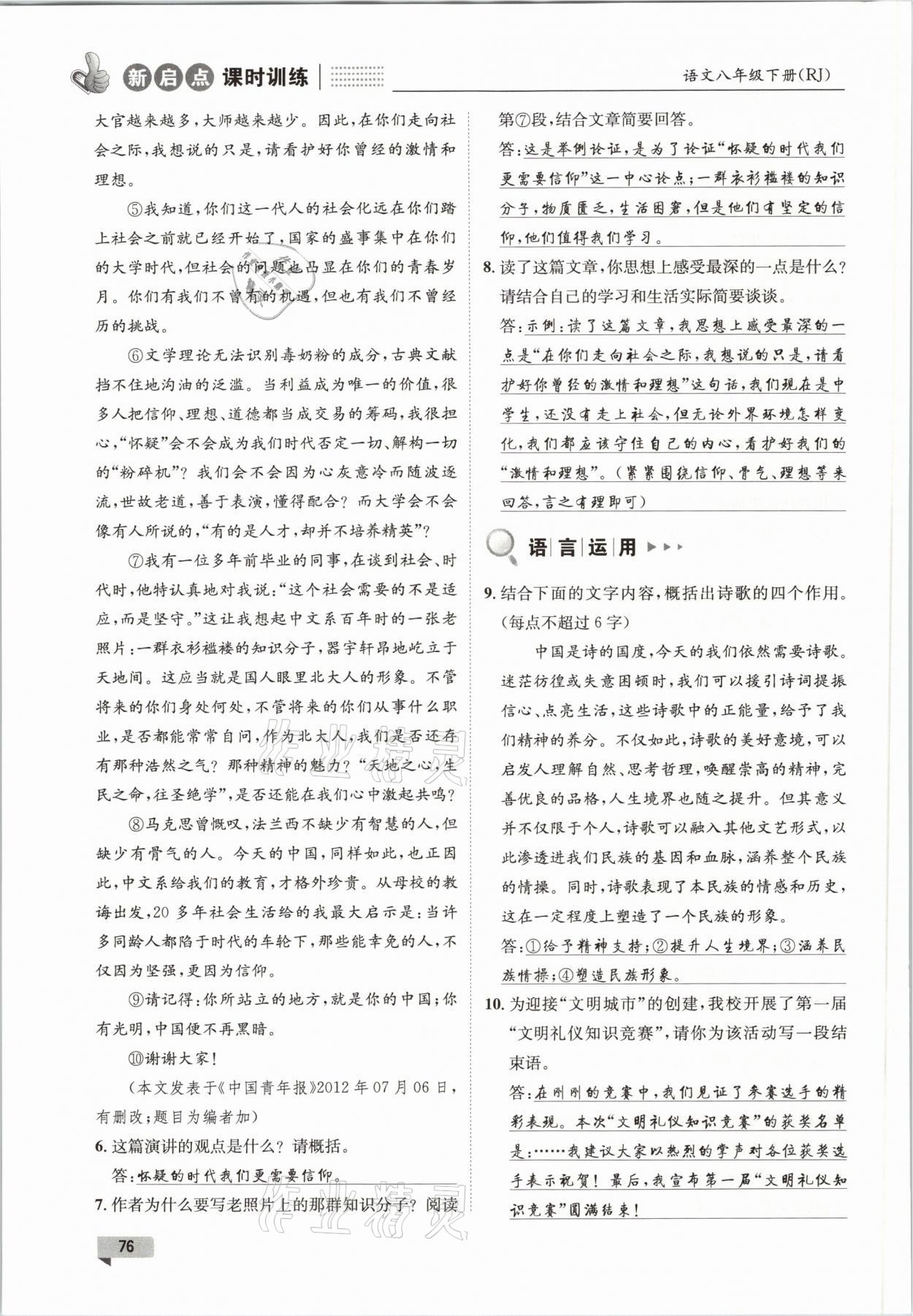 注:目前有些书本章节名称可能整理的还不是很完善,但都是按照顺序排列的,请同学们按照顺序仔细查找。练习册 2021年新启点课时训练八年级语文下册人教版 答案主要是用来给同学们做完题方便对答案用的,请勿直接抄袭。