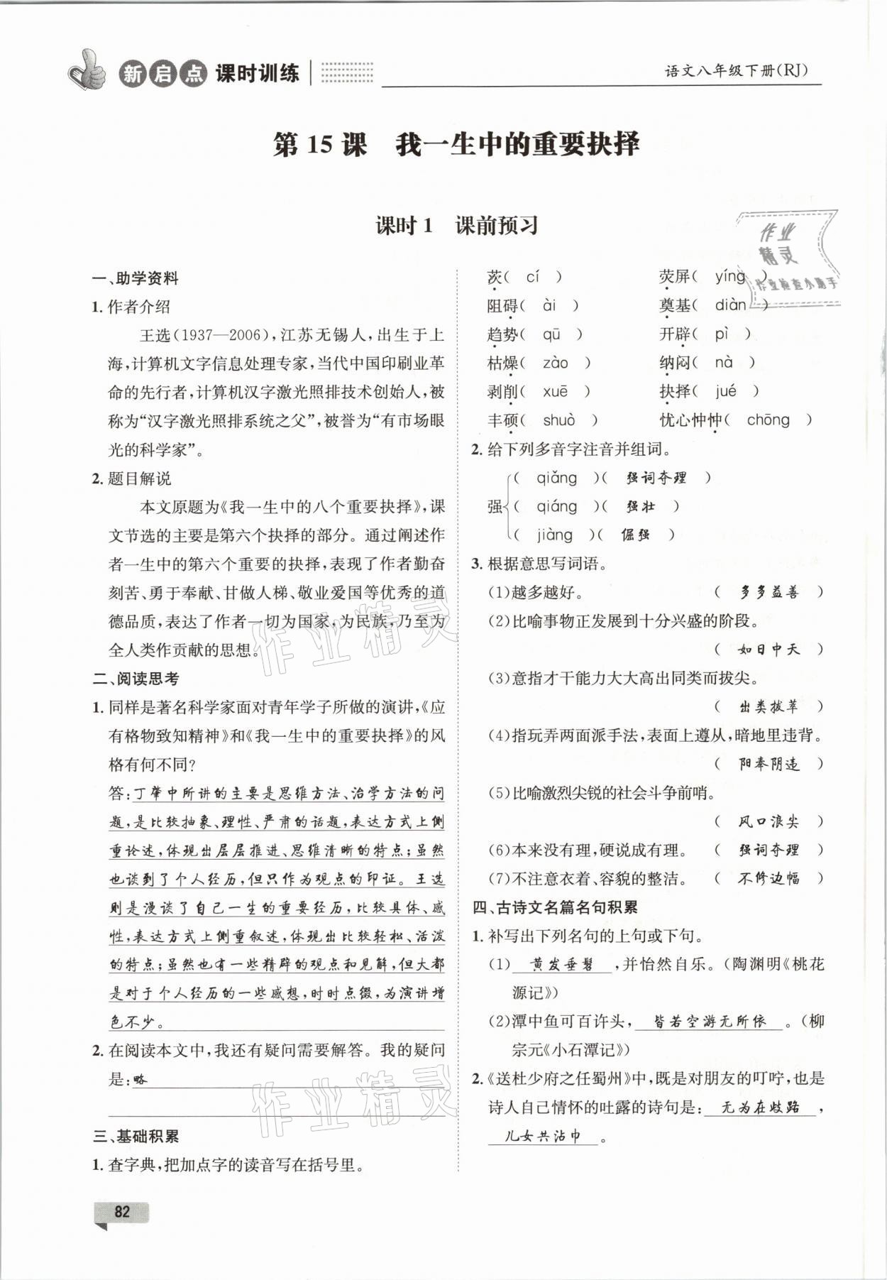 注:目前有些书本章节名称可能整理的还不是很完善,但都是按照顺序排列的,请同学们按照顺序仔细查找。练习册 2021年新启点课时训练八年级语文下册人教版 答案主要是用来给同学们做完题方便对答案用的,请勿直接抄袭。