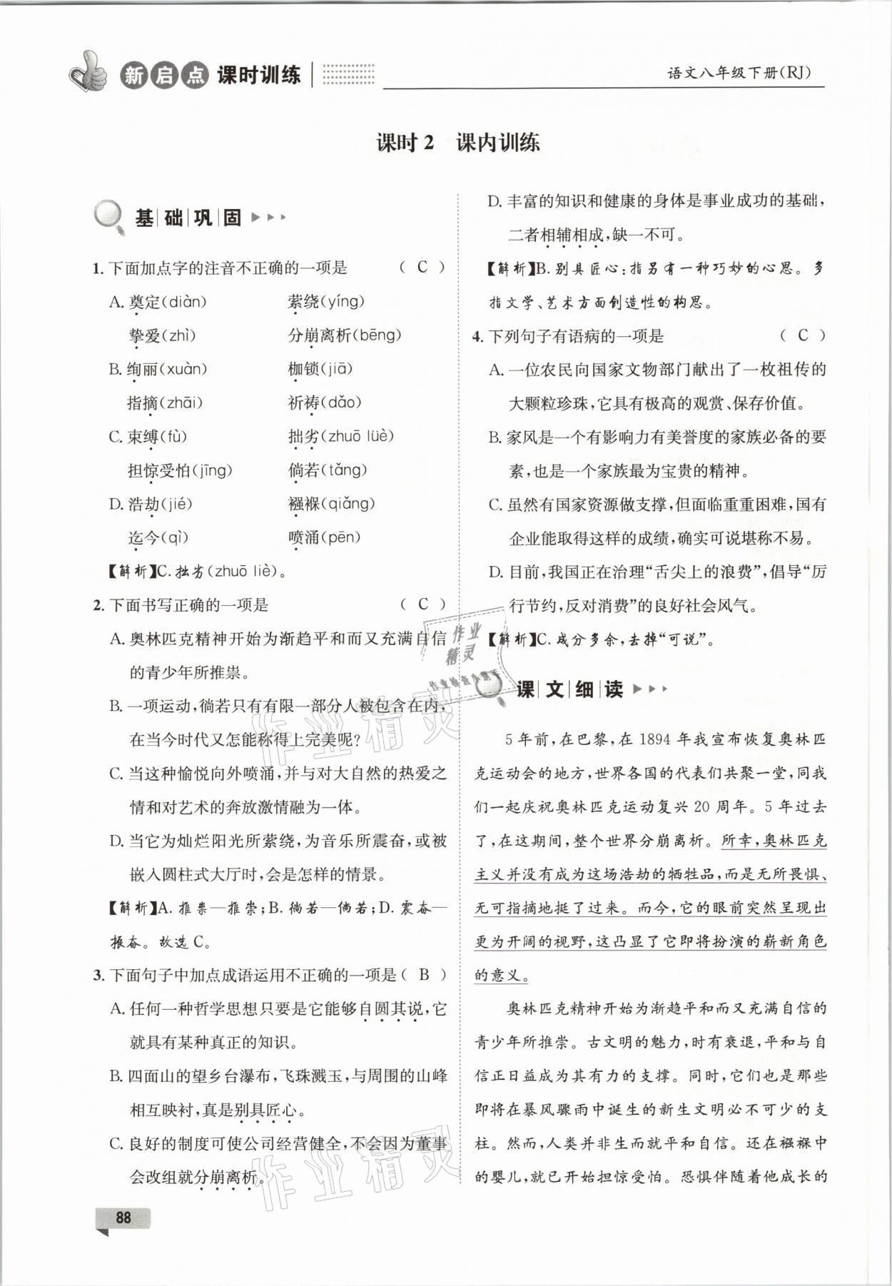 注:目前有些书本章节名称可能整理的还不是很完善,但都是按照顺序排列的,请同学们按照顺序仔细查找。练习册 2021年新启点课时训练八年级语文下册人教版 答案主要是用来给同学们做完题方便对答案用的,请勿直接抄袭。