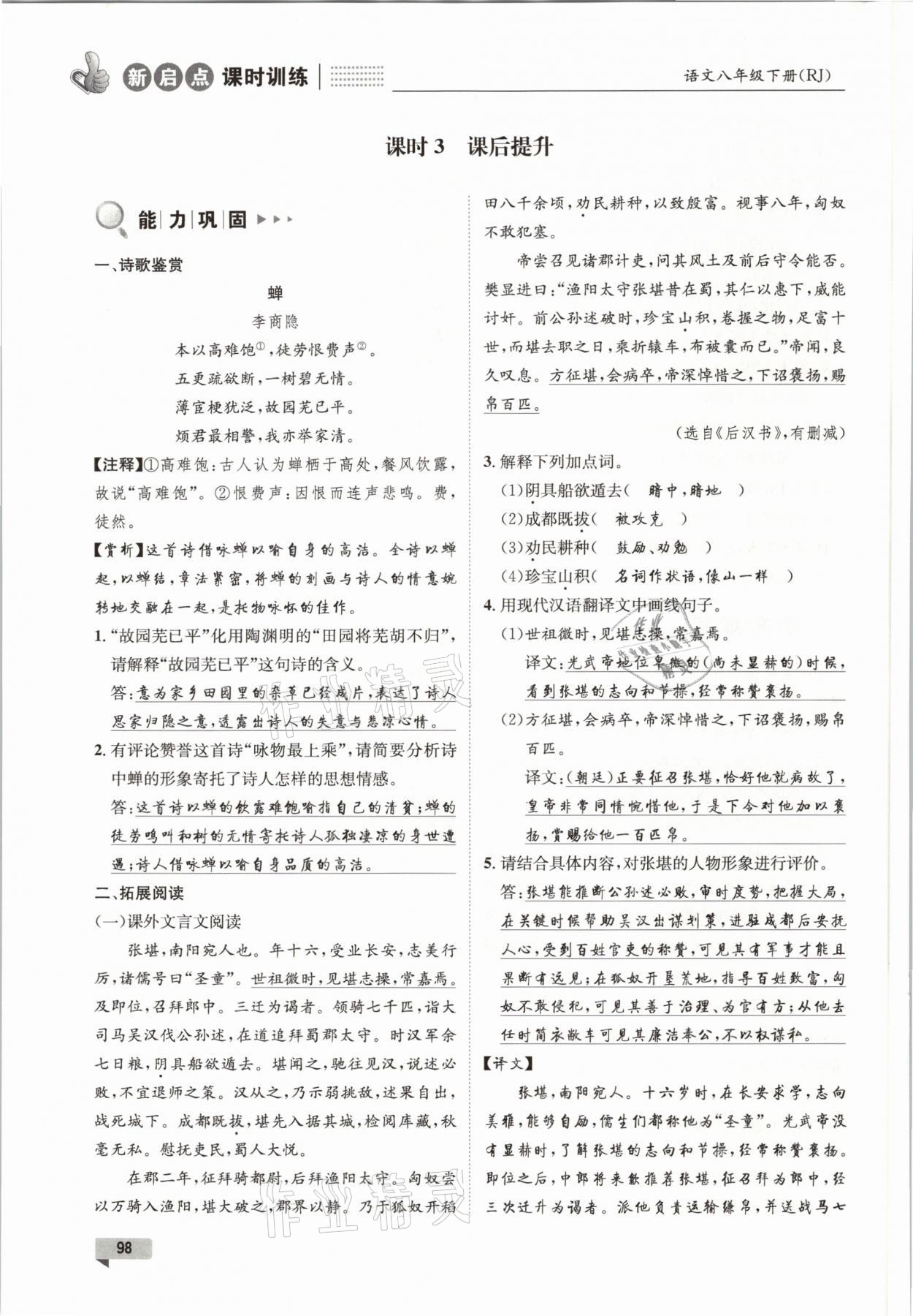 注:目前有些书本章节名称可能整理的还不是很完善,但都是按照顺序排列的,请同学们按照顺序仔细查找。练习册 2021年新启点课时训练八年级语文下册人教版 答案主要是用来给同学们做完题方便对答案用的,请勿直接抄袭。