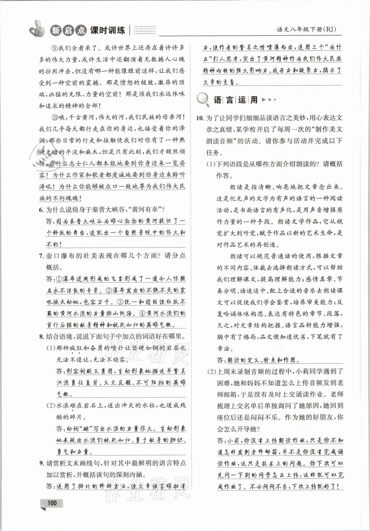 注:目前有些书本章节名称可能整理的还不是很完善,但都是按照顺序排列的,请同学们按照顺序仔细查找。练习册 2021年新启点课时训练八年级语文下册人教版 答案主要是用来给同学们做完题方便对答案用的,请勿直接抄袭。