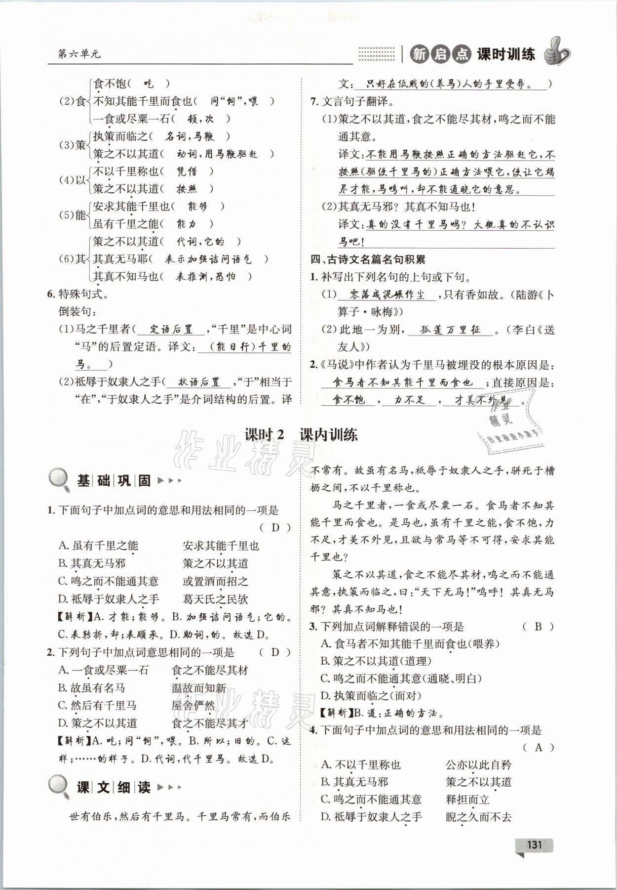 注:目前有些书本章节名称可能整理的还不是很完善,但都是按照顺序排列的,请同学们按照顺序仔细查找。练习册 2021年新启点课时训练八年级语文下册人教版 答案主要是用来给同学们做完题方便对答案用的,请勿直接抄袭。
