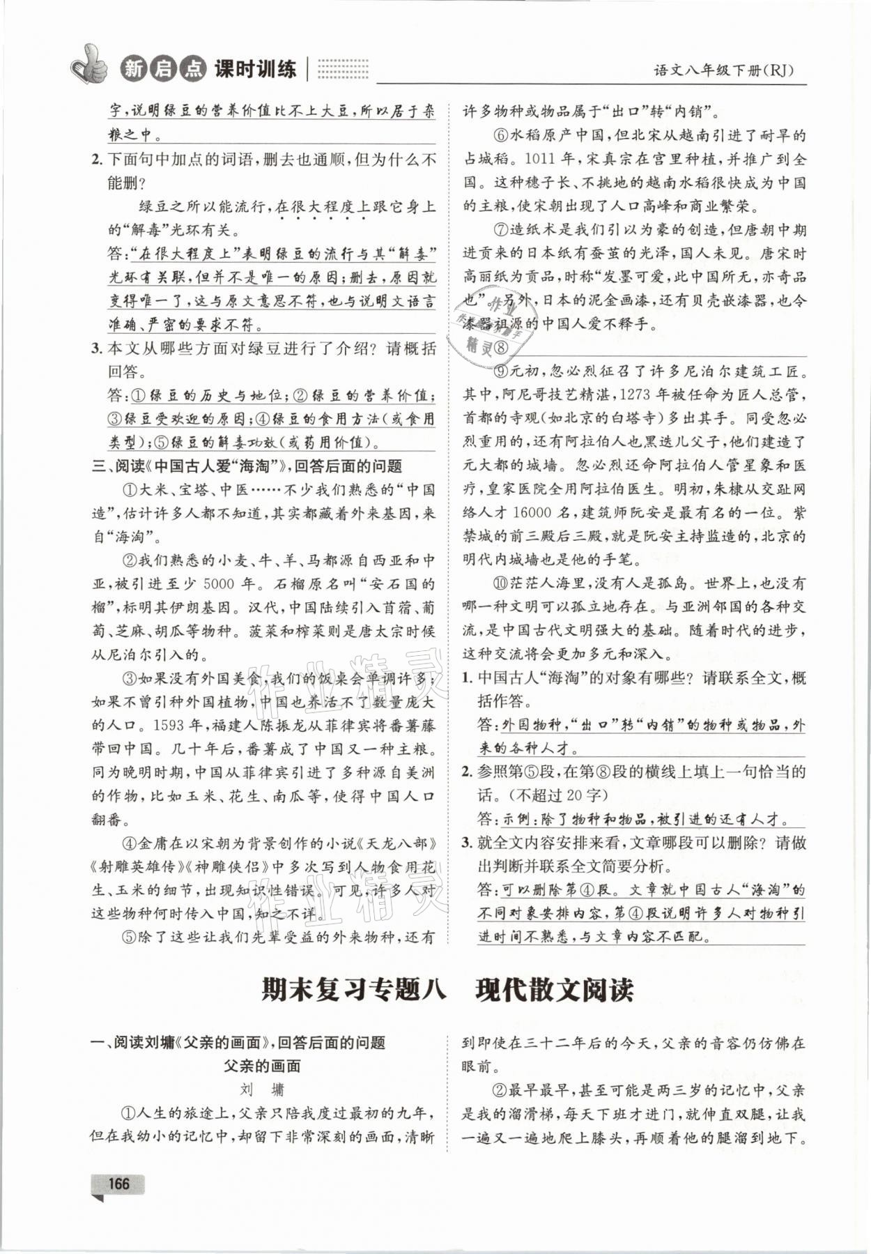 注:目前有些书本章节名称可能整理的还不是很完善,但都是按照顺序排列的,请同学们按照顺序仔细查找。练习册 2021年新启点课时训练八年级语文下册人教版 答案主要是用来给同学们做完题方便对答案用的,请勿直接抄袭。