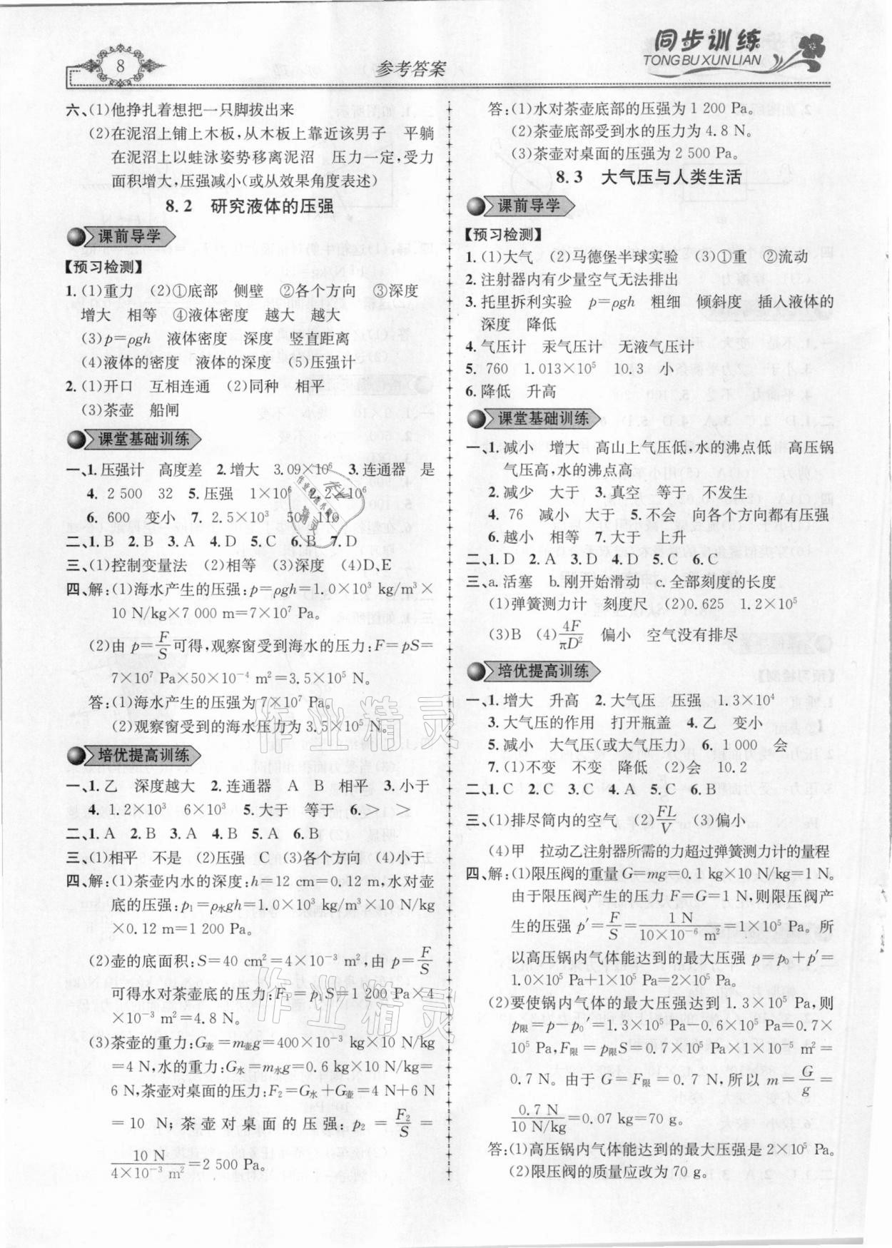 注:目前有些书本章节名称可能整理的还不是很完善,但都是按照顺序排列的,请同学们按照顺序仔细查找。练习册 2021年同步训练创新作业八年级物理下册沪粤版 答案主要是用来给同学们做完题方便对答案用的,请勿直接抄袭。