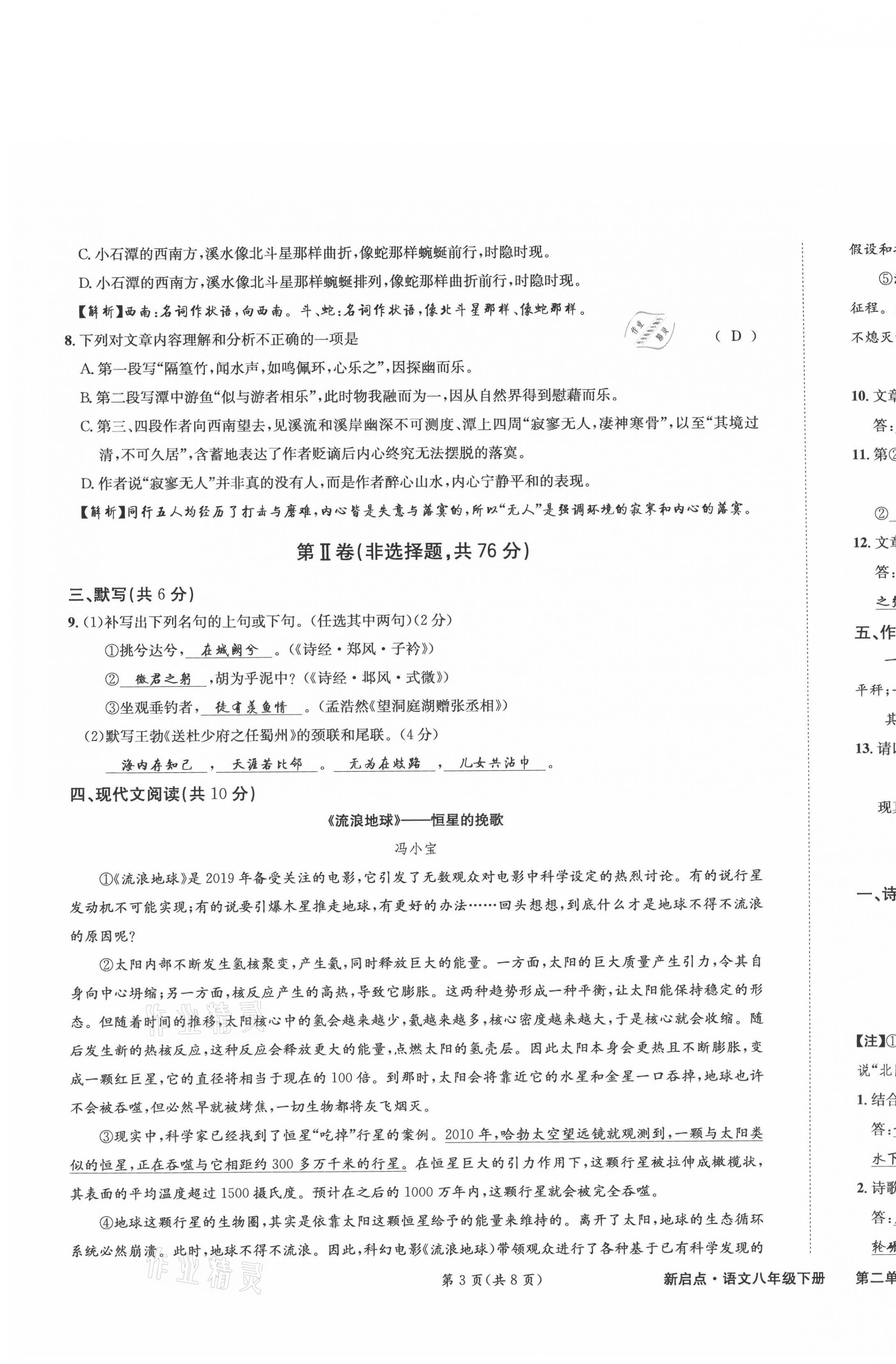 注:目前有些书本章节名称可能整理的还不是很完善,但都是按照顺序排列的,请同学们按照顺序仔细查找。练习册 2021年新启点课时训练八年级语文下册人教版 答案主要是用来给同学们做完题方便对答案用的,请勿直接抄袭。