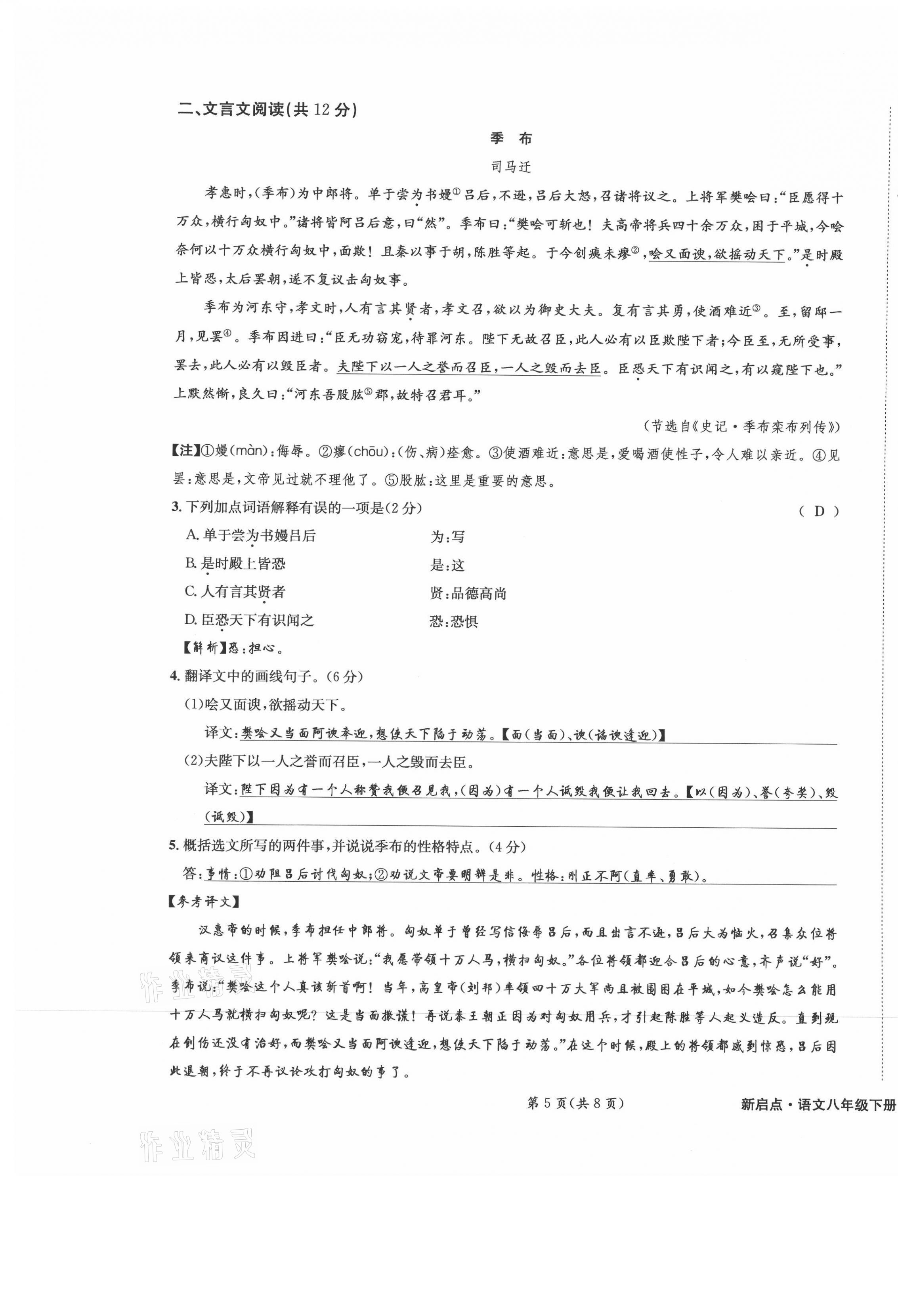 注:目前有些书本章节名称可能整理的还不是很完善,但都是按照顺序排列的,请同学们按照顺序仔细查找。练习册 2021年新启点课时训练八年级语文下册人教版 答案主要是用来给同学们做完题方便对答案用的,请勿直接抄袭。