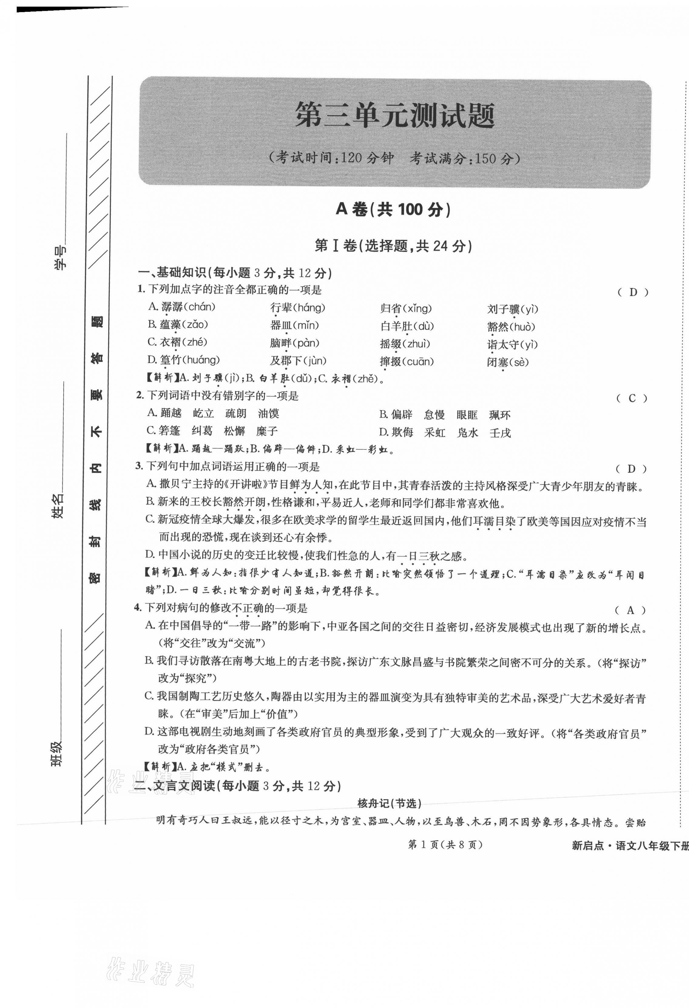 注:目前有些书本章节名称可能整理的还不是很完善,但都是按照顺序排列的,请同学们按照顺序仔细查找。练习册 2021年新启点课时训练八年级语文下册人教版 答案主要是用来给同学们做完题方便对答案用的,请勿直接抄袭。
