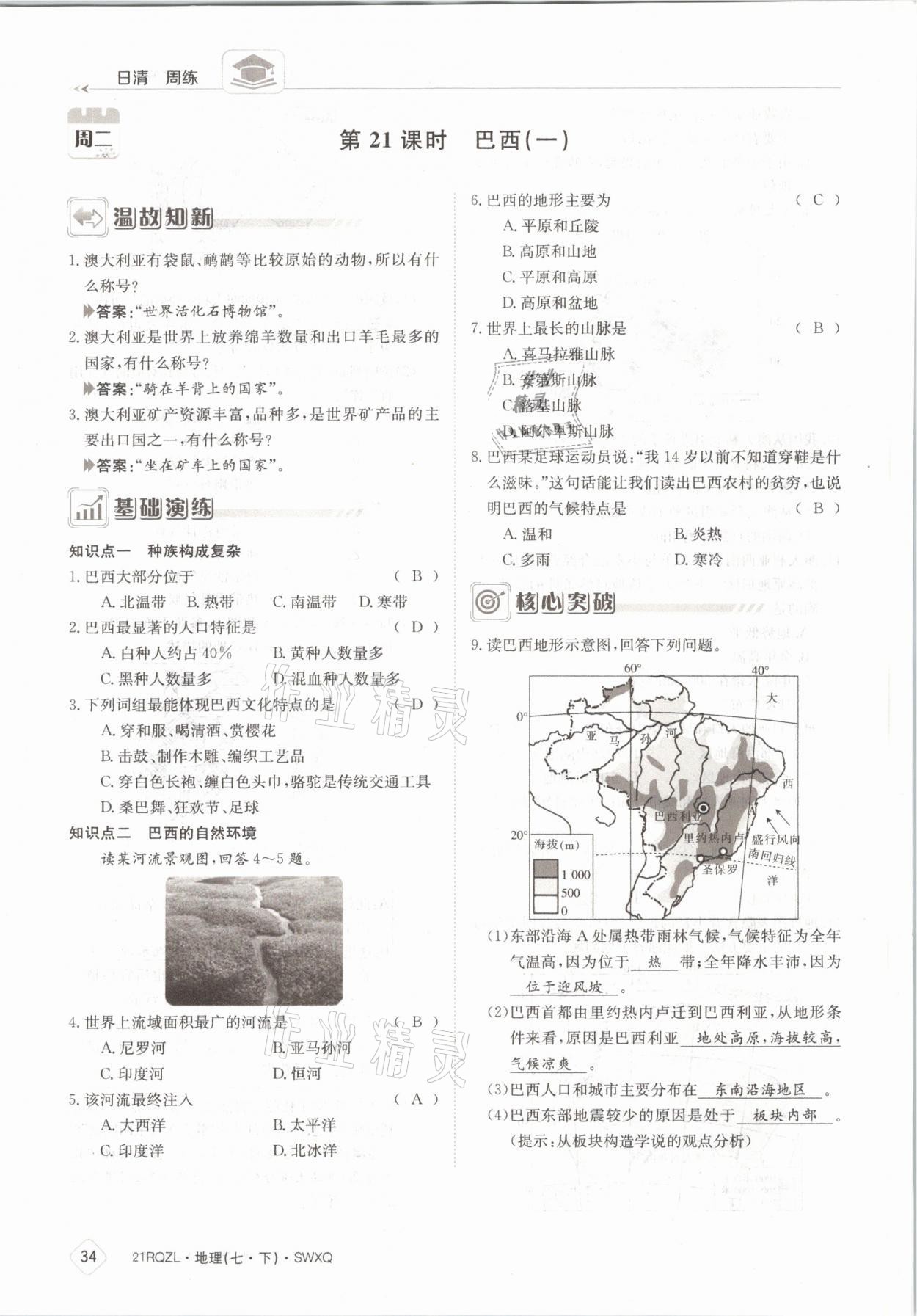 注:目前有些书本章节名称可能整理的还不是很完善,但都是按照顺序排列的,请同学们按照顺序仔细查找。练习册 2021年日清周练七年级地理下册商务星球版 答案主要是用来给同学们做完题方便对答案用的,请勿直接抄袭。