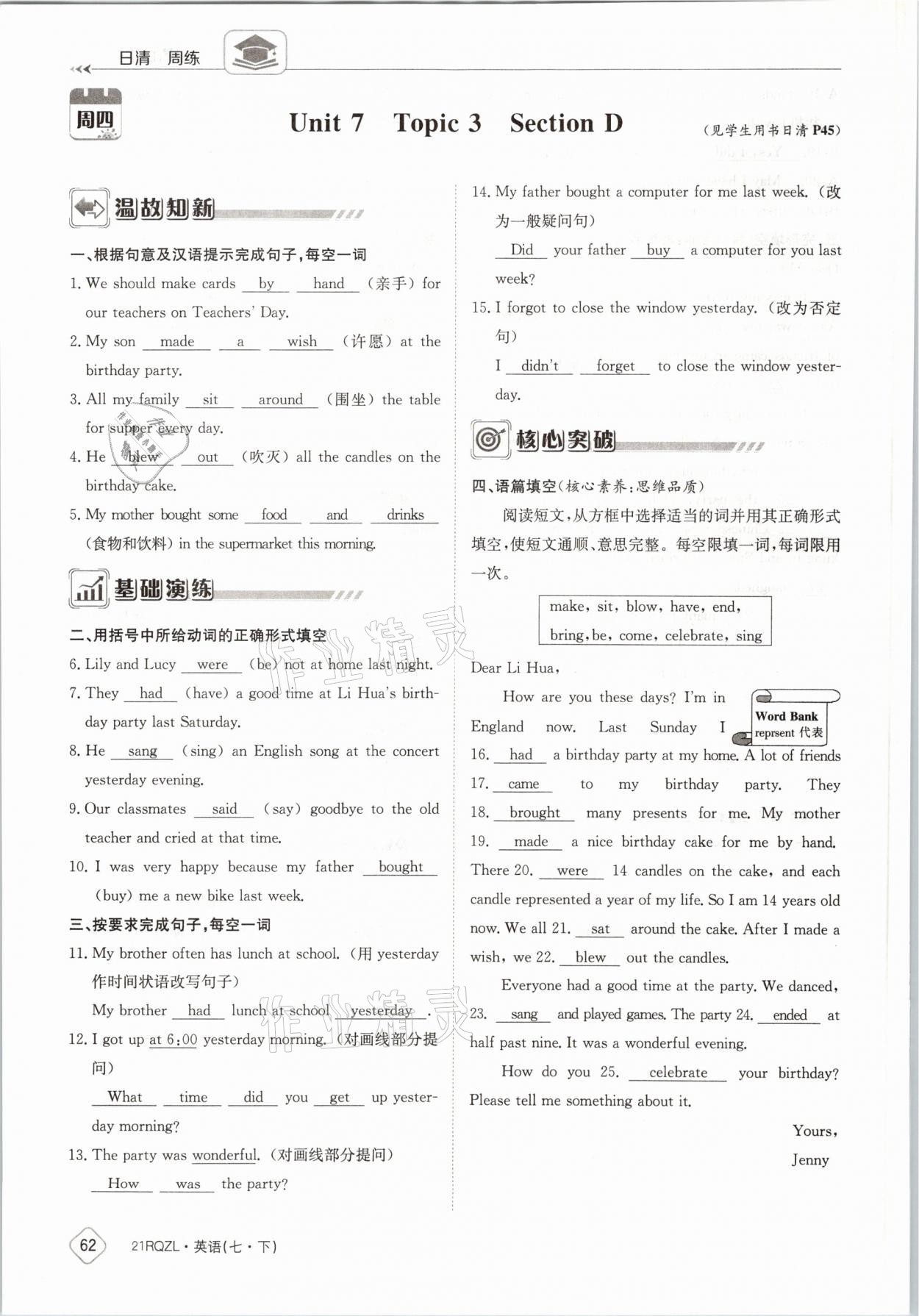 注:目前有些书本章节名称可能整理的还不是很完善,但都是按照顺序排列的,请同学们按照顺序仔细查找。练习册 2021年日清周练七年级英语下册外研版 答案主要是用来给同学们做完题方便对答案用的,请勿直接抄袭。