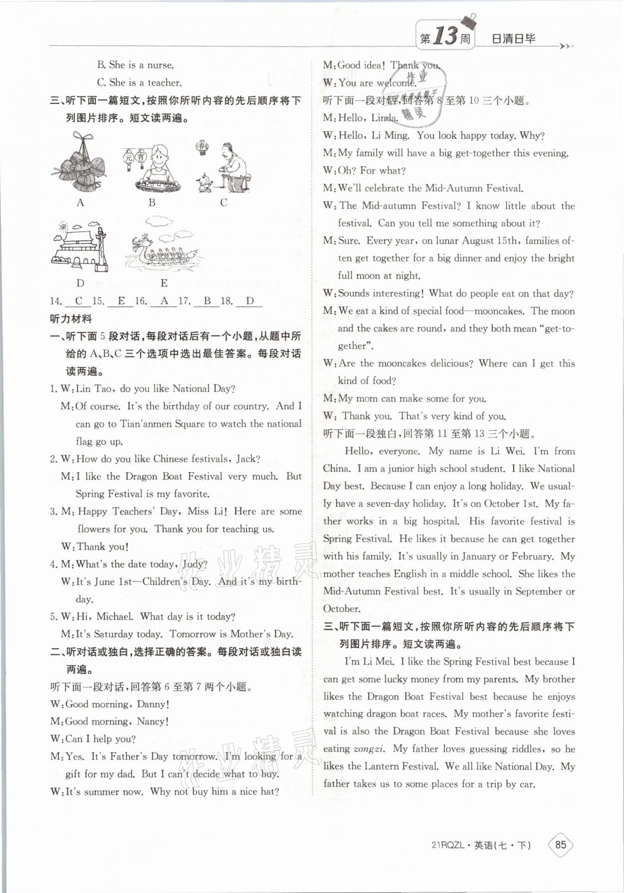 注:目前有些书本章节名称可能整理的还不是很完善,但都是按照顺序排列的,请同学们按照顺序仔细查找。练习册 2021年日清周练七年级英语下册外研版 答案主要是用来给同学们做完题方便对答案用的,请勿直接抄袭。