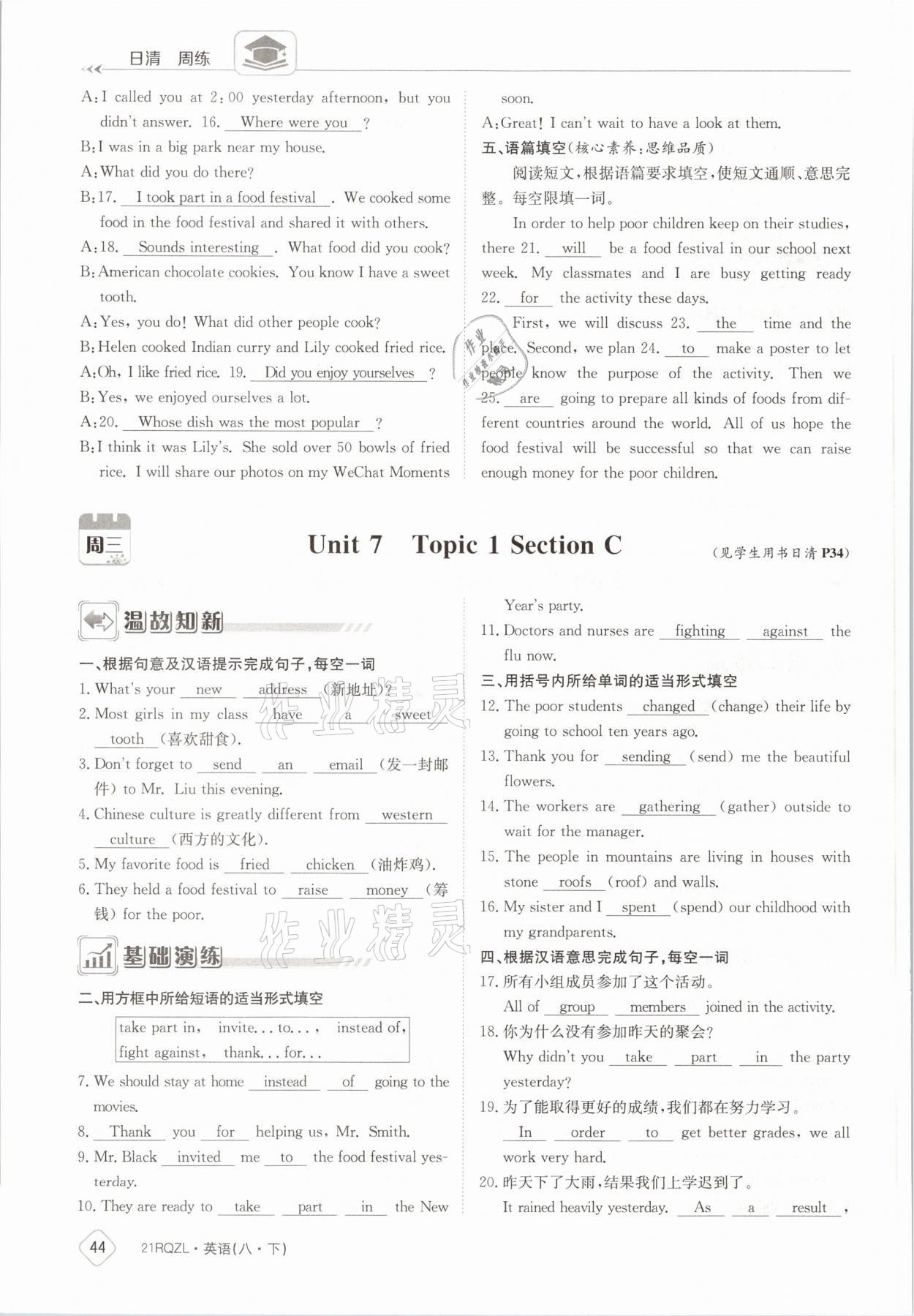 注:目前有些书本章节名称可能整理的还不是很完善,但都是按照顺序排列的,请同学们按照顺序仔细查找。练习册 2021年日清周练八年级英语下册外研版 答案主要是用来给同学们做完题方便对答案用的,请勿直接抄袭。