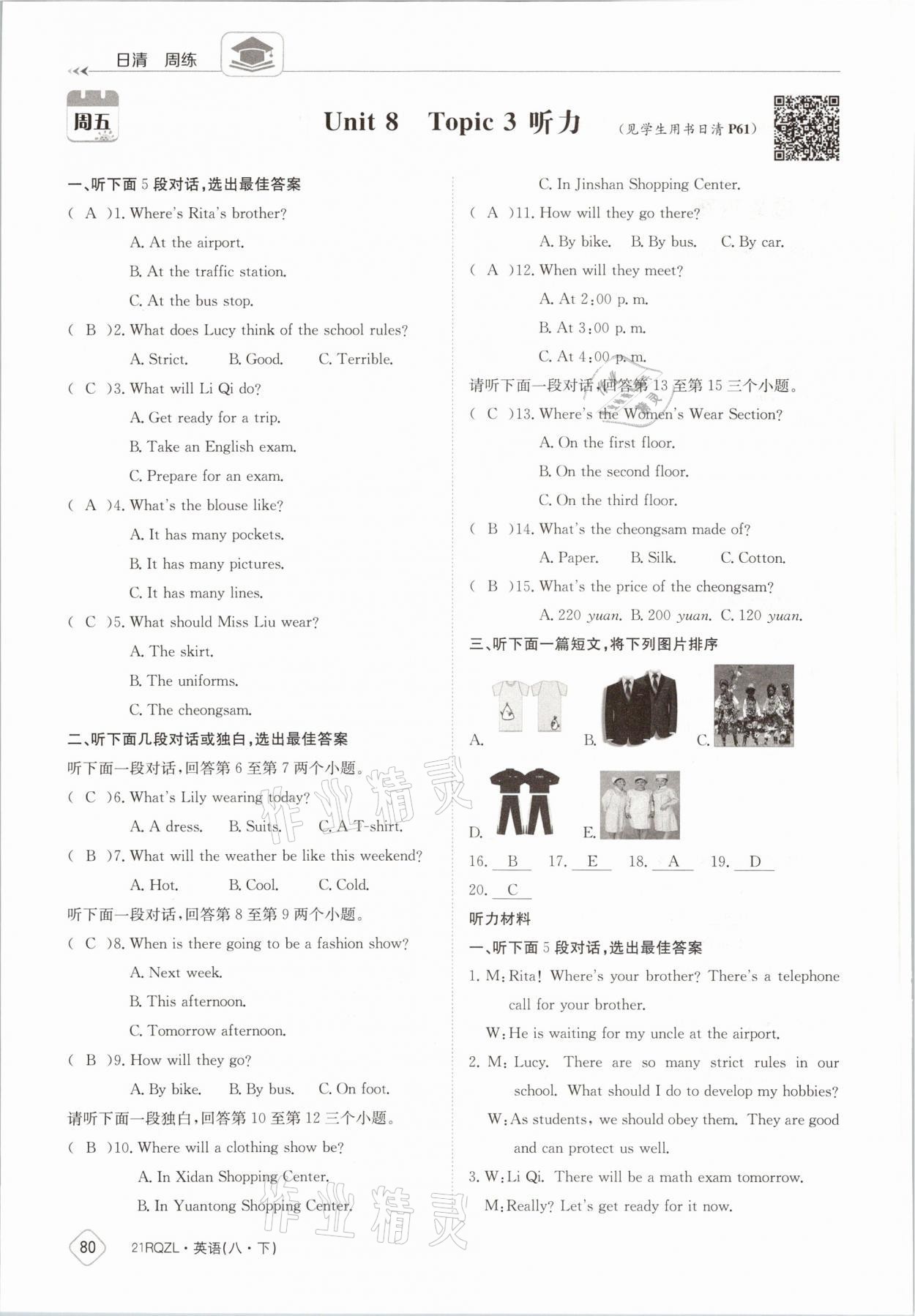 注:目前有些书本章节名称可能整理的还不是很完善,但都是按照顺序排列的,请同学们按照顺序仔细查找。练习册 2021年日清周练八年级英语下册外研版 答案主要是用来给同学们做完题方便对答案用的,请勿直接抄袭。