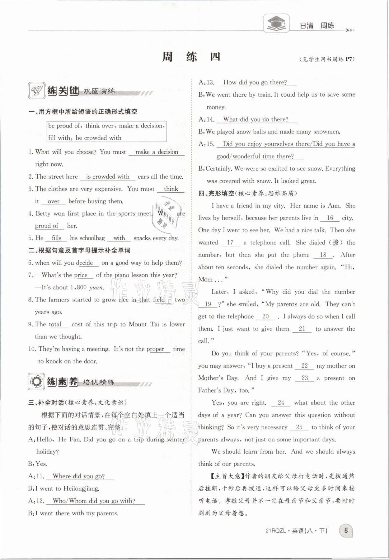 注:目前有些书本章节名称可能整理的还不是很完善,但都是按照顺序排列的,请同学们按照顺序仔细查找。练习册 2021年日清周练八年级英语下册外研版 答案主要是用来给同学们做完题方便对答案用的,请勿直接抄袭。