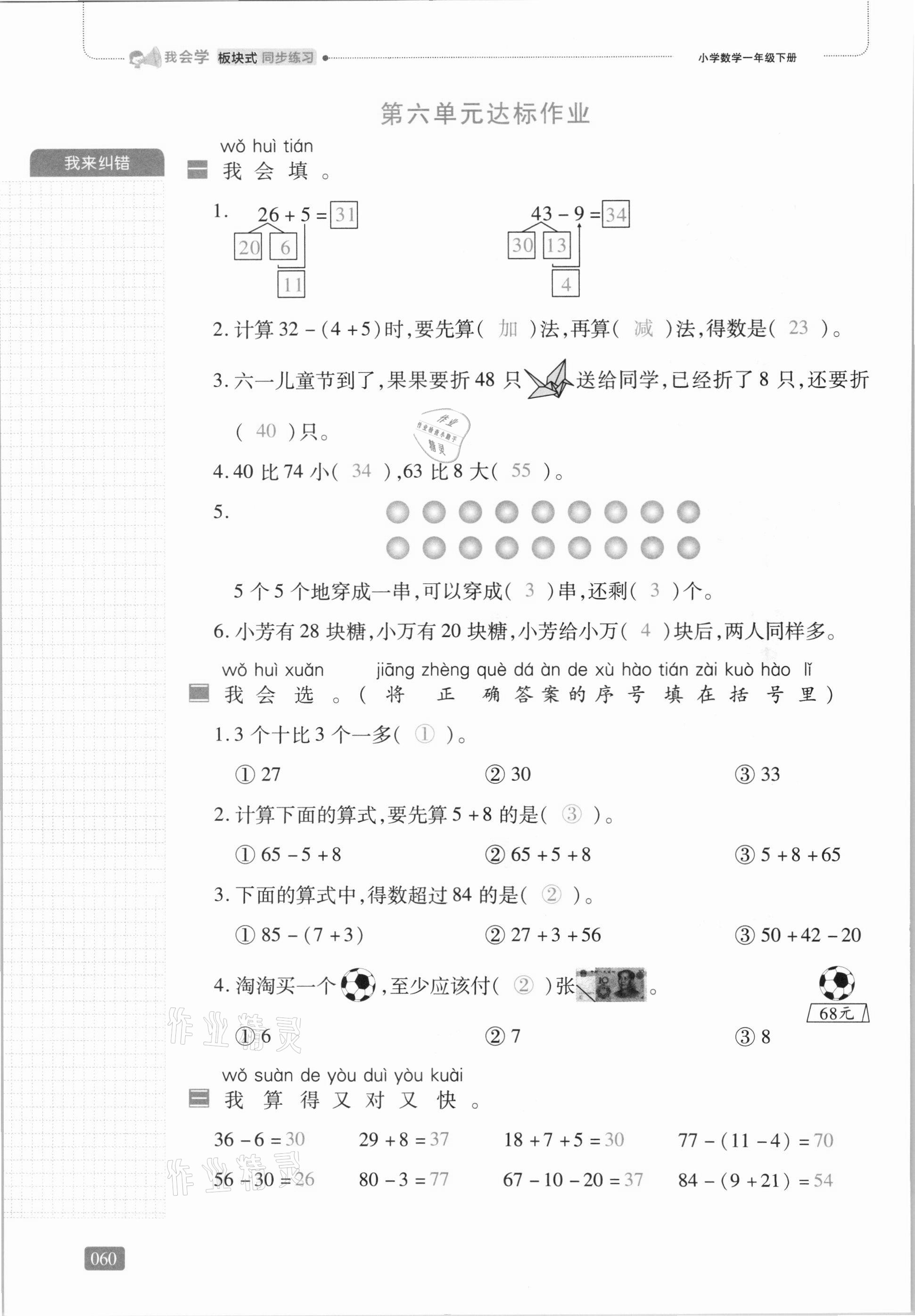 注:目前有些书本章节名称可能整理的还不是很完善,但都是按照顺序排列的,请同学们按照顺序仔细查找。练习册 2021年我会学板块式同步练习一年级数学下册人教版 答案主要是用来给同学们做完题方便对答案用的,请勿直接抄袭。