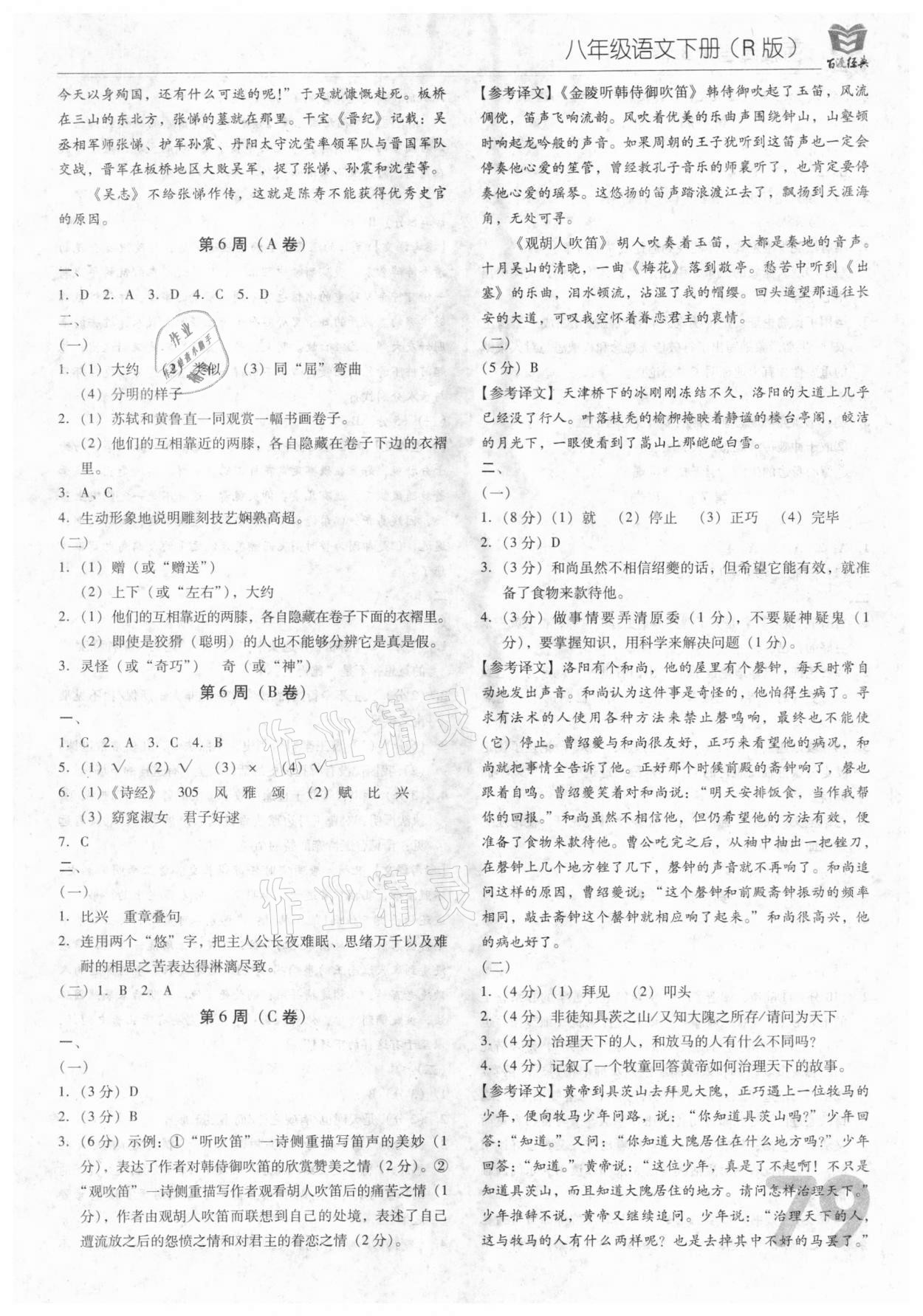注:目前有些书本章节名称可能整理的还不是很完善,但都是按照顺序排列的,请同学们按照顺序仔细查找。练习册 2021年百渡周考AB卷八年级语文下册人教版 答案主要是用来给同学们做完题方便对答案用的,请勿直接抄袭。