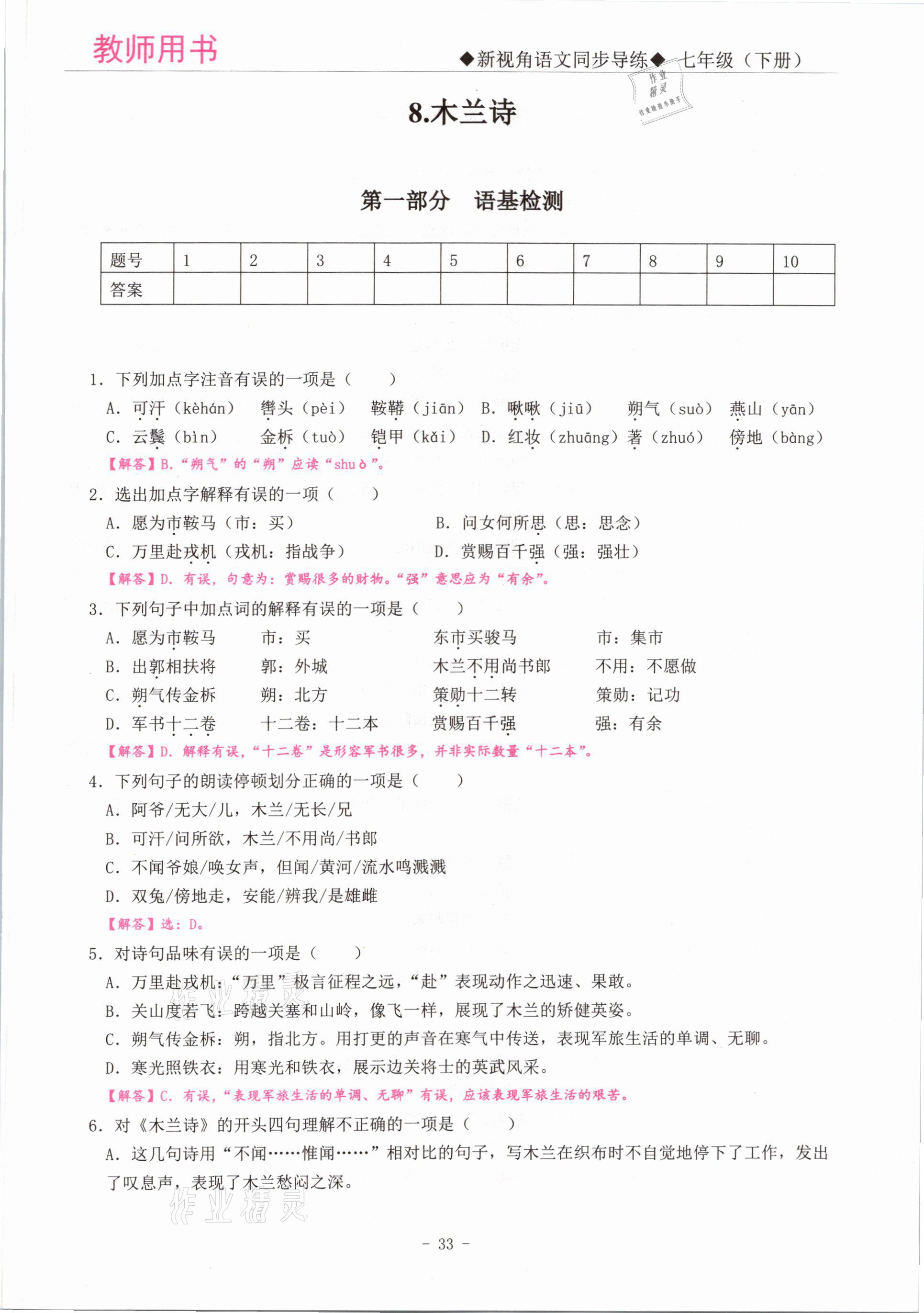 注:目前有些书本章节名称可能整理的还不是很完善,但都是按照顺序排列的,请同学们按照顺序仔细查找。练习册 2021年新视角教辅系列丛书七年级语文下册人教版 答案主要是用来给同学们做完题方便对答案用的,请勿直接抄袭。