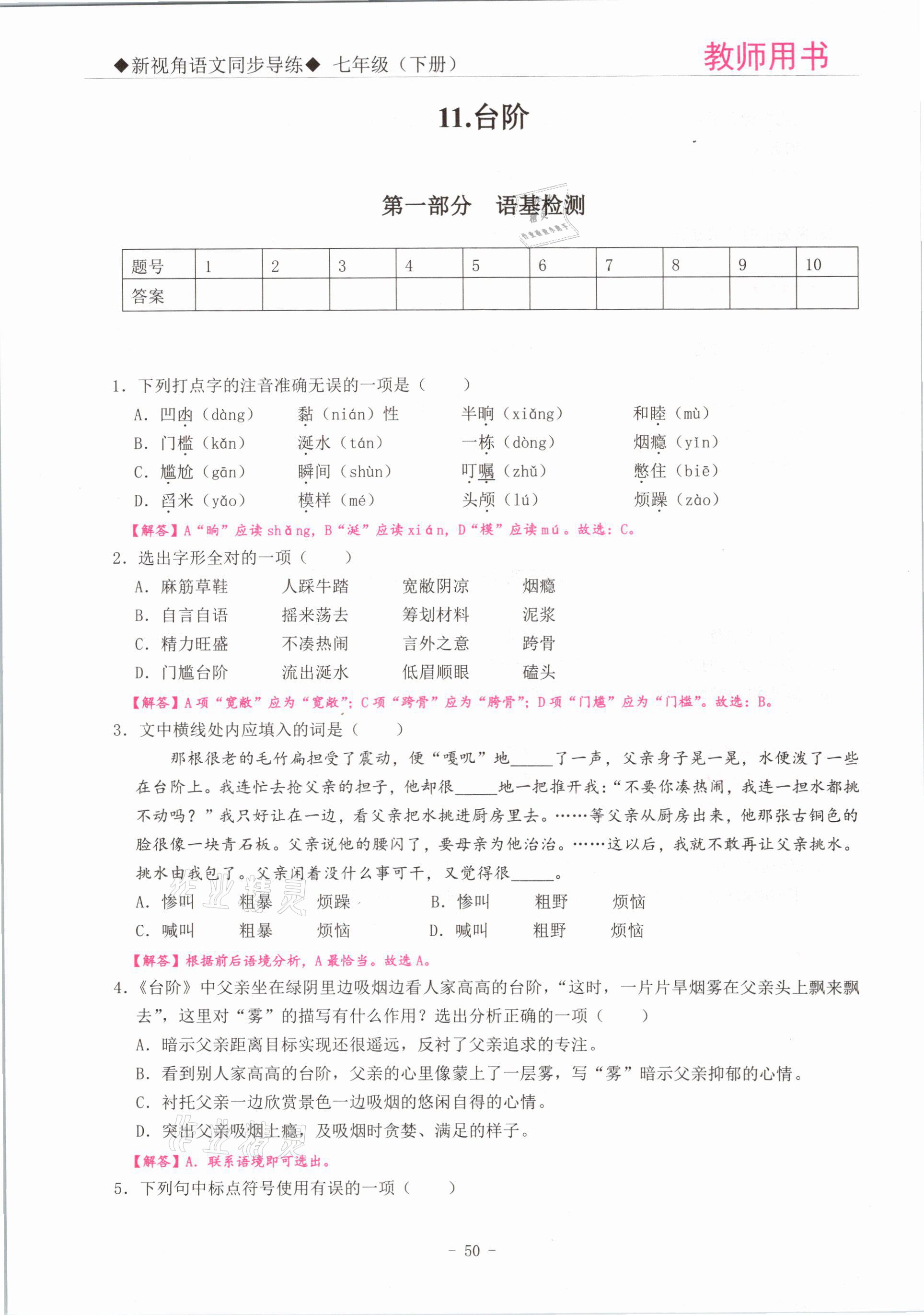 注:目前有些书本章节名称可能整理的还不是很完善,但都是按照顺序排列的,请同学们按照顺序仔细查找。练习册 2021年新视角教辅系列丛书七年级语文下册人教版 答案主要是用来给同学们做完题方便对答案用的,请勿直接抄袭。