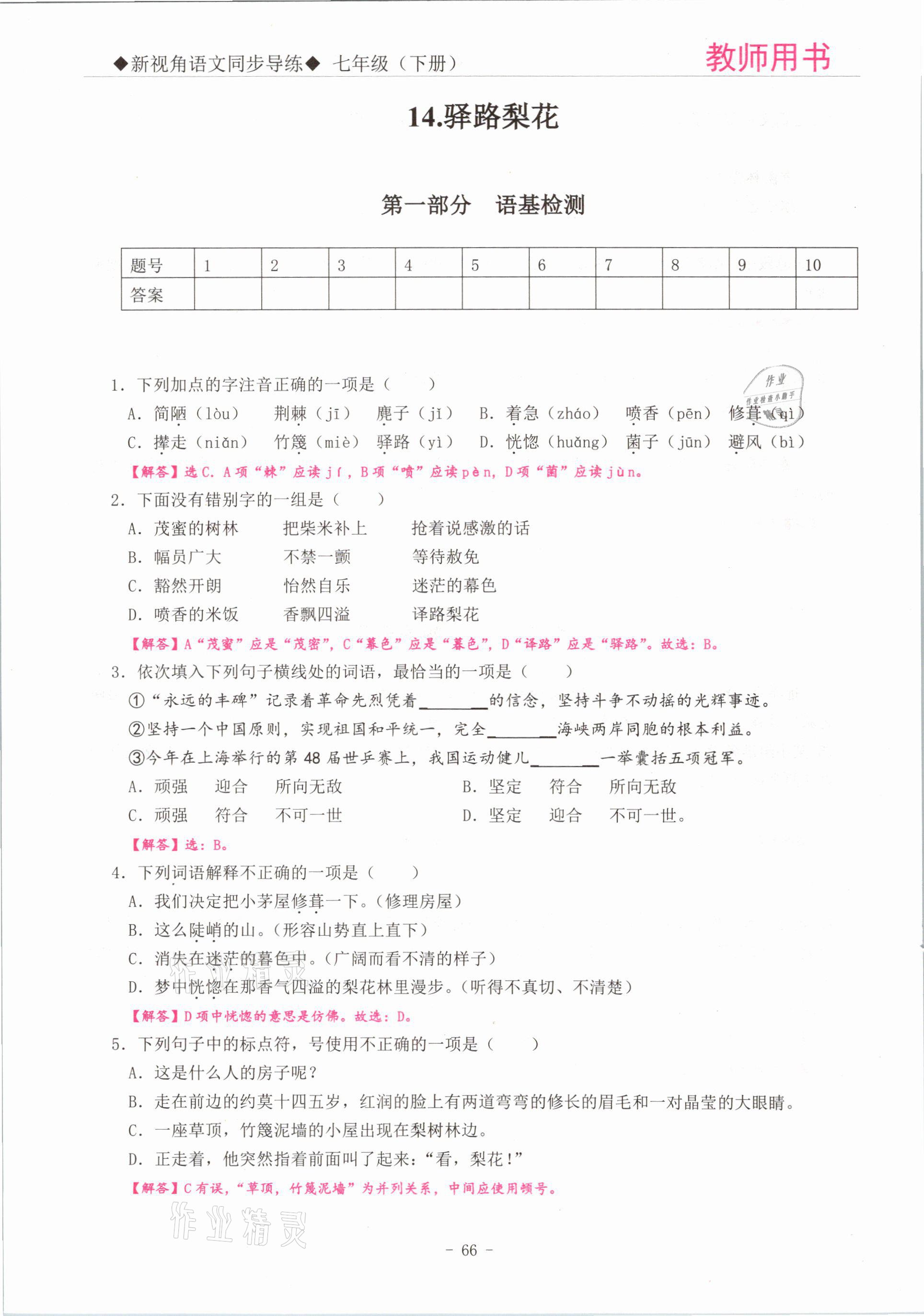 注:目前有些书本章节名称可能整理的还不是很完善,但都是按照顺序排列的,请同学们按照顺序仔细查找。练习册 2021年新视角教辅系列丛书七年级语文下册人教版 答案主要是用来给同学们做完题方便对答案用的,请勿直接抄袭。