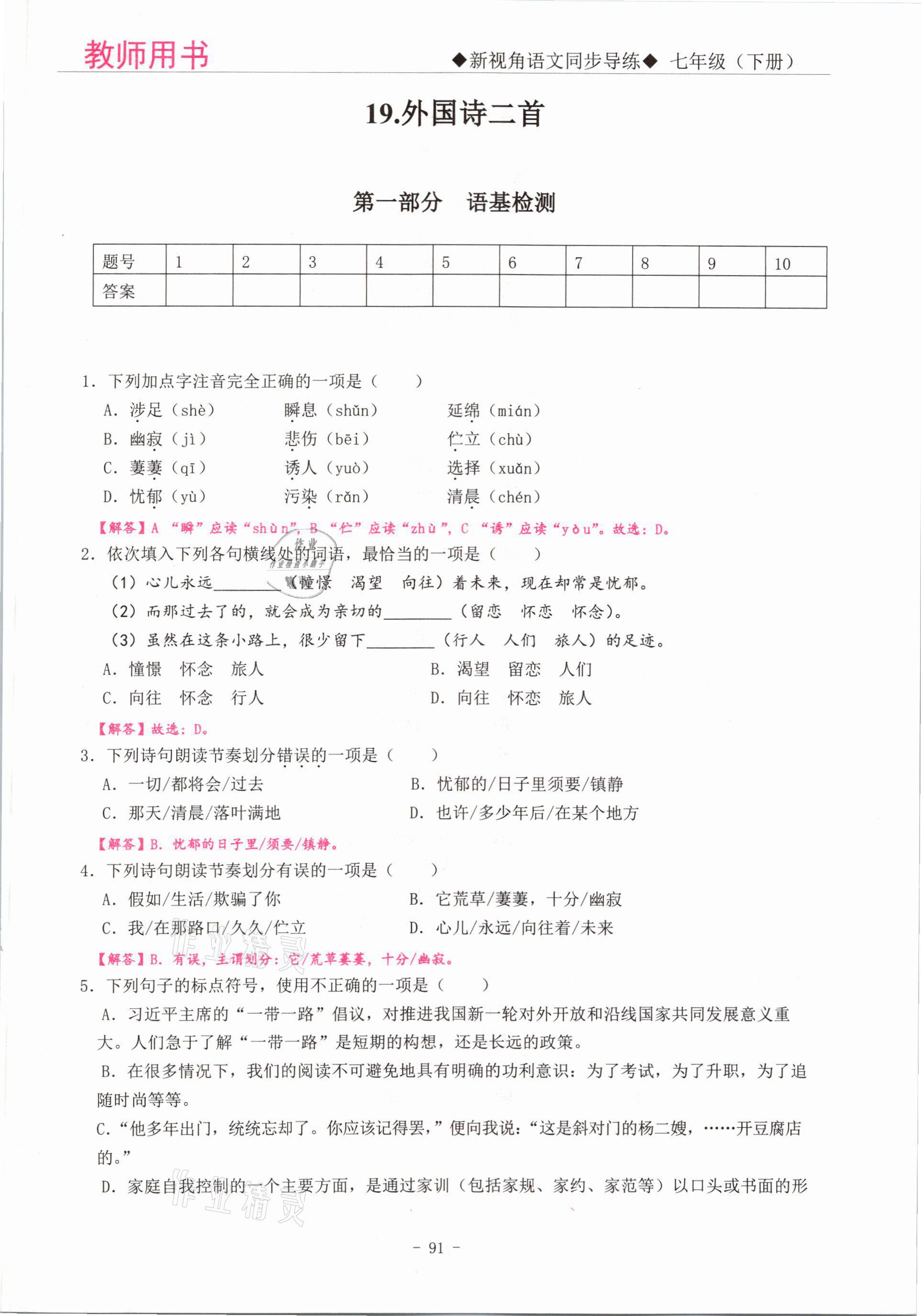 注:目前有些书本章节名称可能整理的还不是很完善,但都是按照顺序排列的,请同学们按照顺序仔细查找。练习册 2021年新视角教辅系列丛书七年级语文下册人教版 答案主要是用来给同学们做完题方便对答案用的,请勿直接抄袭。