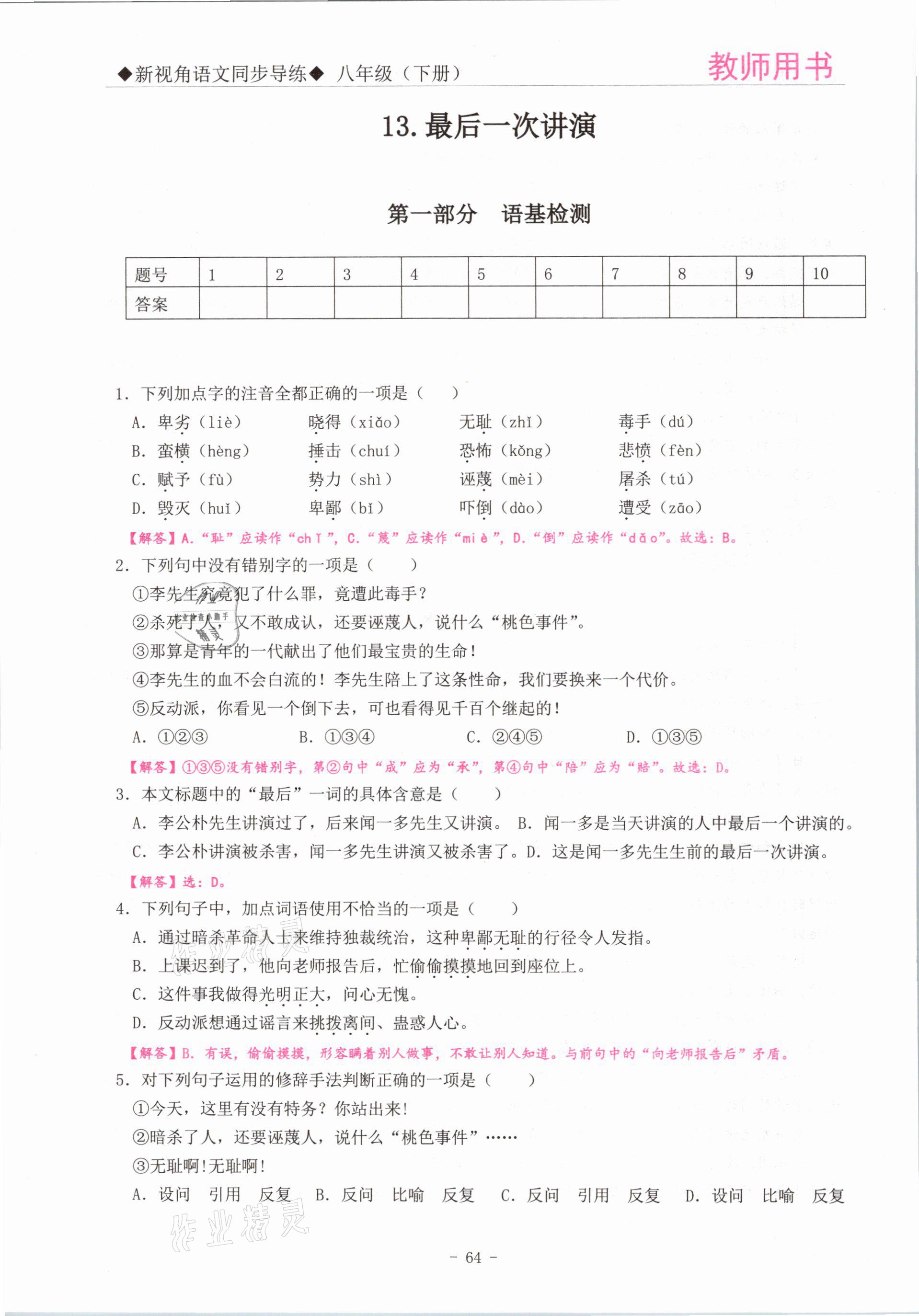 注:目前有些书本章节名称可能整理的还不是很完善,但都是按照顺序排列的,请同学们按照顺序仔细查找。练习册 2021年新视角教辅系列丛书八年级语文下册人教版 答案主要是用来给同学们做完题方便对答案用的,请勿直接抄袭。