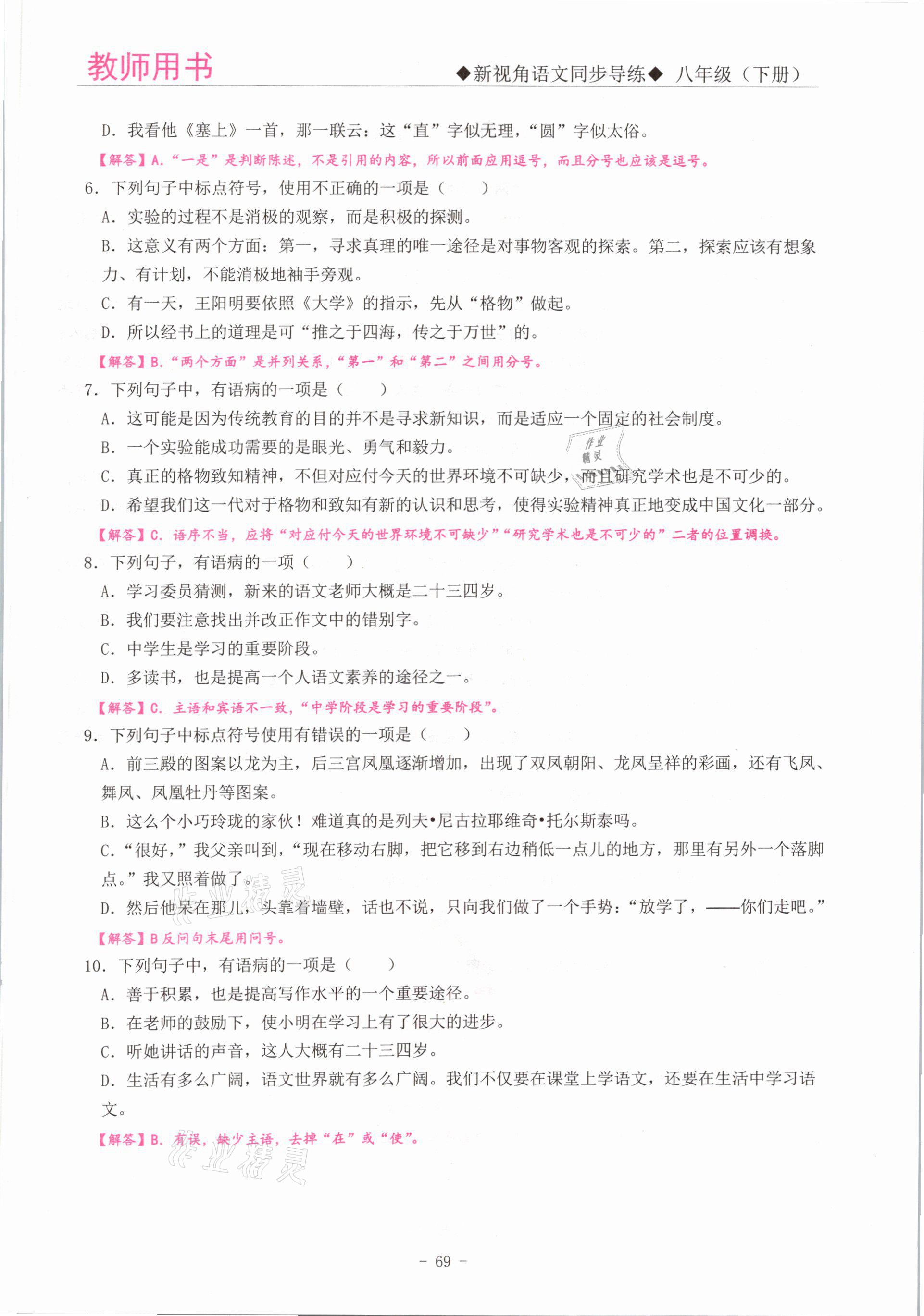 注:目前有些书本章节名称可能整理的还不是很完善,但都是按照顺序排列的,请同学们按照顺序仔细查找。练习册 2021年新视角教辅系列丛书八年级语文下册人教版 答案主要是用来给同学们做完题方便对答案用的,请勿直接抄袭。