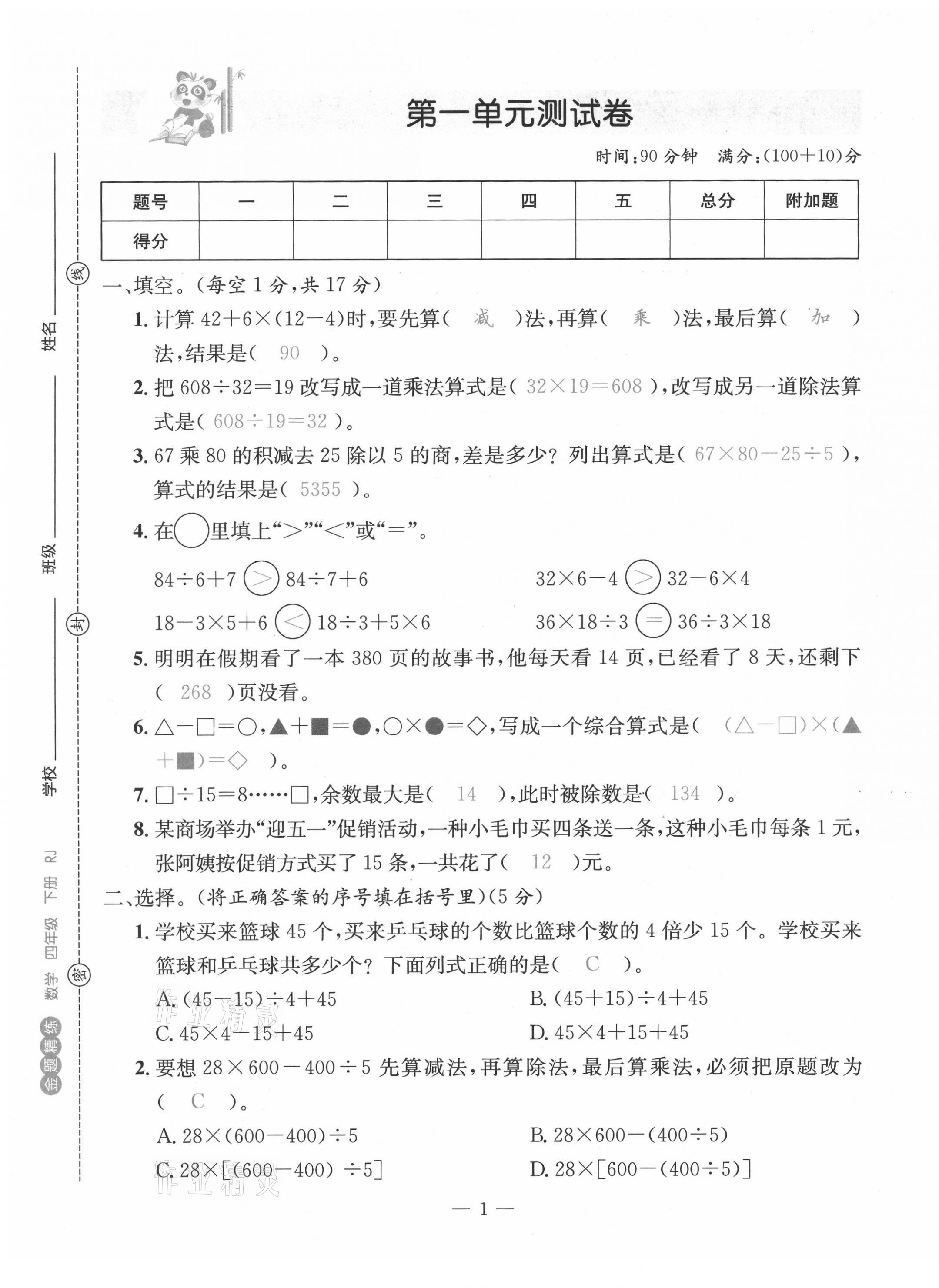 注:目前有些书本章节名称可能整理的还不是很完善,但都是按照顺序排列的,请同学们按照顺序仔细查找。练习册 2021年合力数学金题精练四年级下册人教版 答案主要是用来给同学们做完题方便对答案用的,请勿直接抄袭。