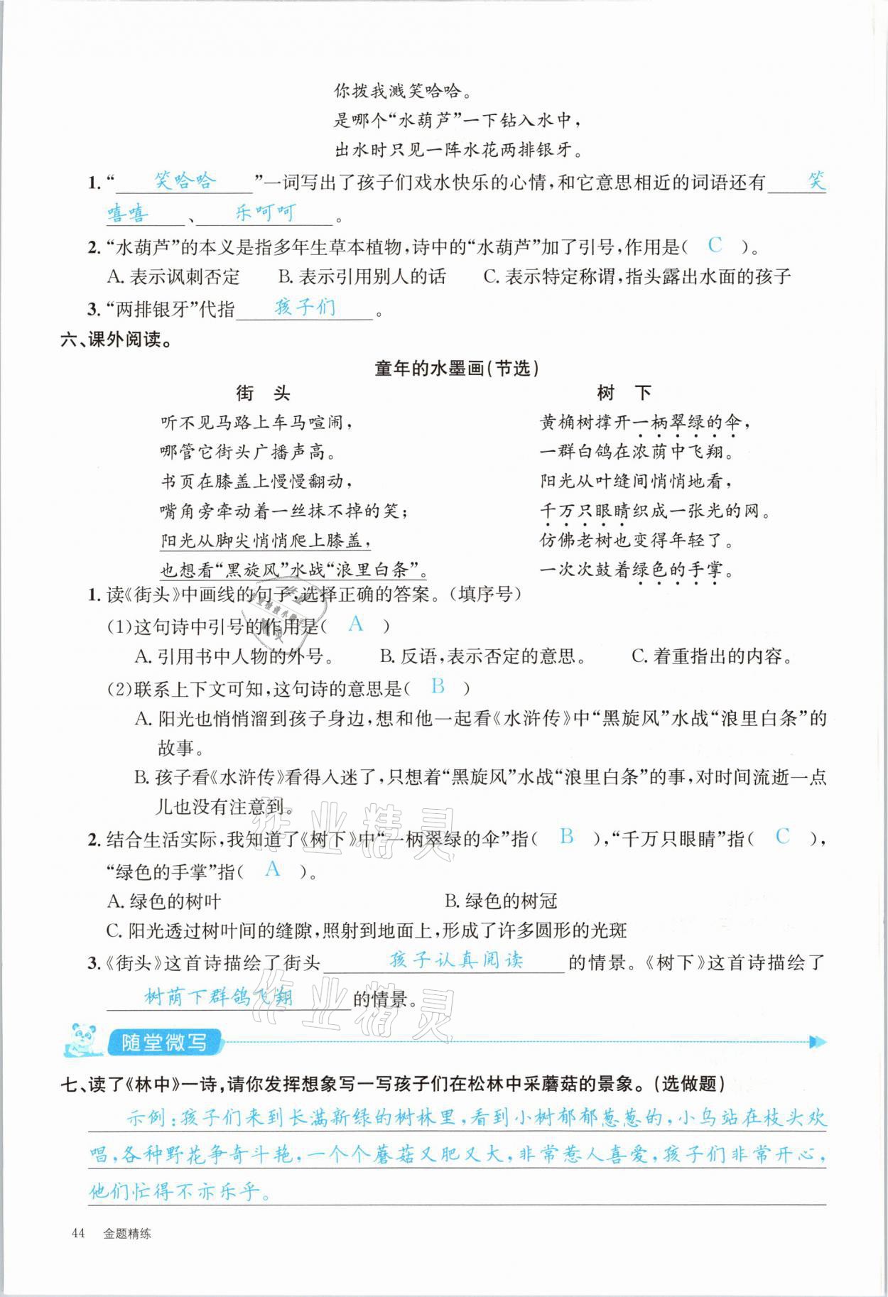 注:目前有些书本章节名称可能整理的还不是很完善,但都是按照顺序排列的,请同学们按照顺序仔细查找。练习册 2021年合力语文金题精练三年级下册人教版 答案主要是用来给同学们做完题方便对答案用的,请勿直接抄袭。
