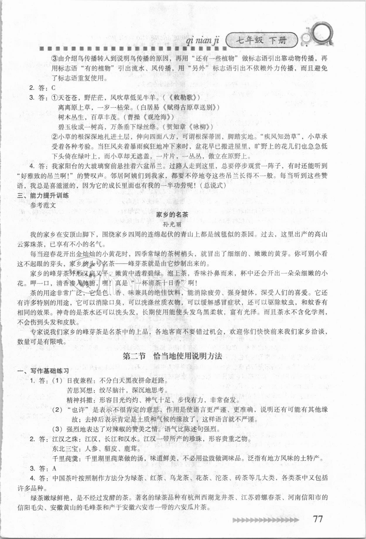 注:目前有些书本章节名称可能整理的还不是很完善,但都是按照顺序排列的,请同学们按照顺序仔细查找。练习册 2021年中学生作文教材七年级下册人教版 答案主要是用来给同学们做完题方便对答案用的,请勿直接抄袭。