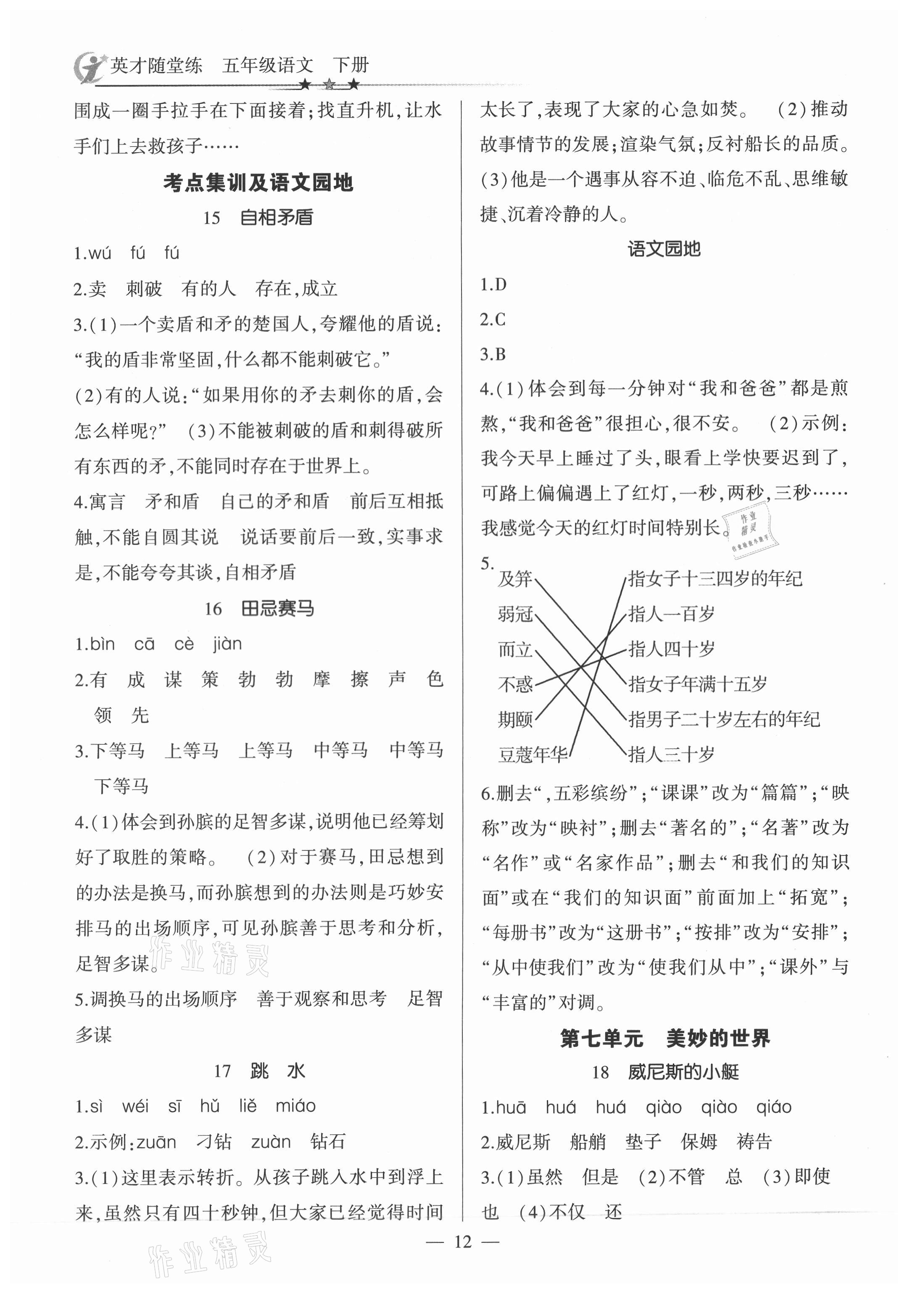 注:目前有些书本章节名称可能整理的还不是很完善,但都是按照顺序排列的,请同学们按照顺序仔细查找。练习册 2021年英才随堂练五年级语文下册人教版 答案主要是用来给同学们做完题方便对答案用的,请勿直接抄袭。