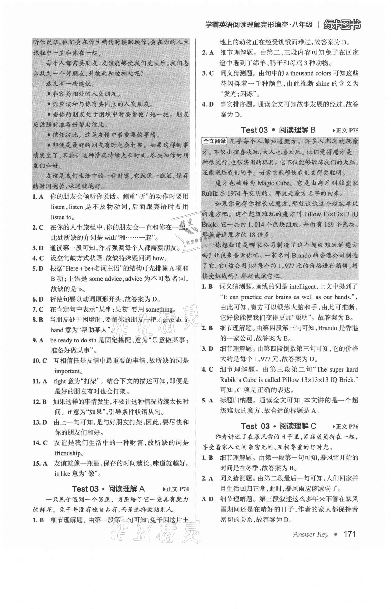 注:目前有些书本章节名称可能整理的还不是很完善,但都是按照顺序排列的,请同学们按照顺序仔细查找。练习册 2021年学霸英语阅读理解完形填空八年级 答案主要是用来给同学们做完题方便对答案用的,请勿直接抄袭。