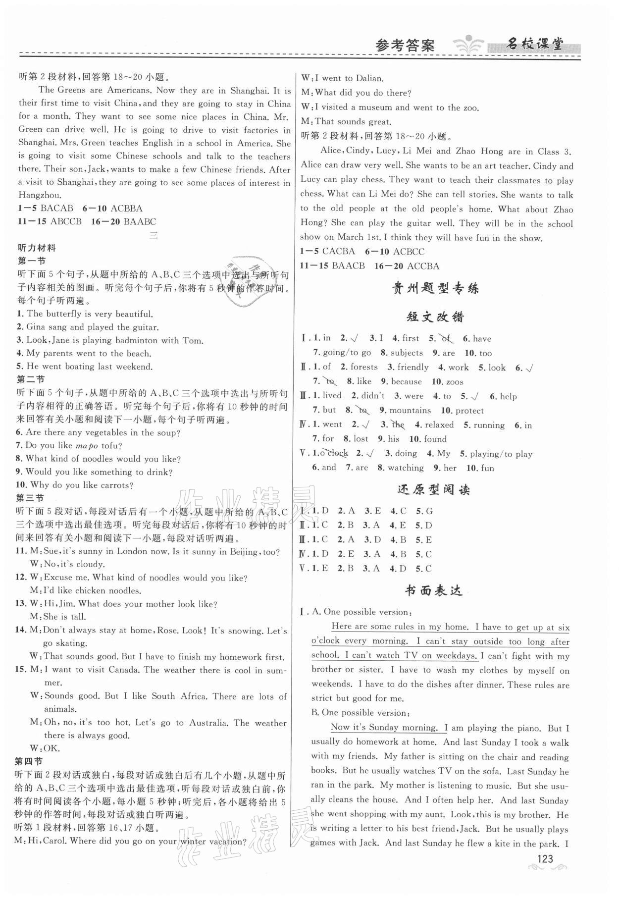 注:目前有些书本章节名称可能整理的还不是很完善,但都是按照顺序排列的,请同学们按照顺序仔细查找。练习册 2021年名校课堂七年级英语下册人教版地区专版贵州人民出版社 答案主要是用来给同学们做完题方便对答案用的,请勿直接抄袭。
