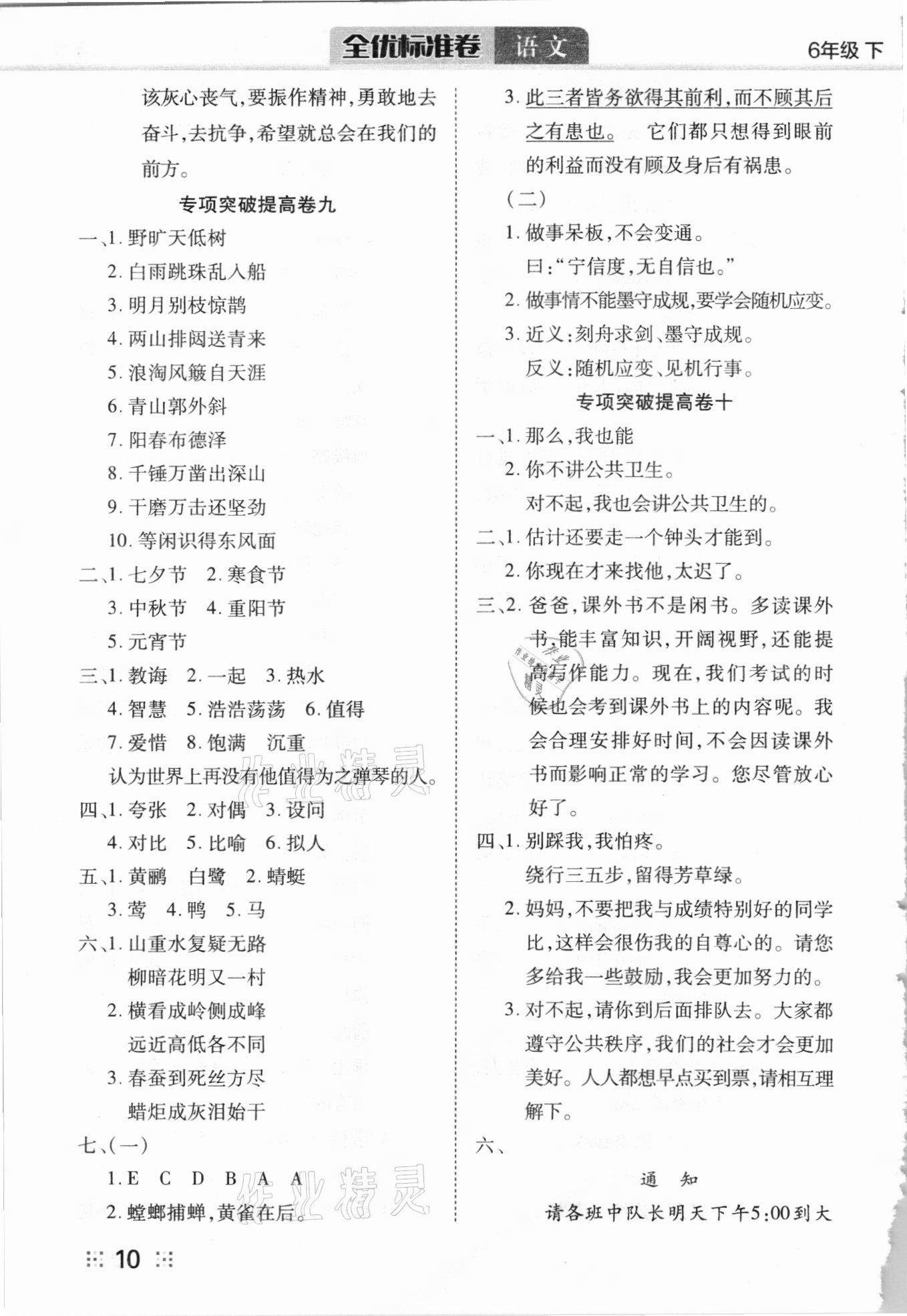 注:目前有些书本章节名称可能整理的还不是很完善,但都是按照顺序排列的,请同学们按照顺序仔细查找。练习册 2021年全优标准卷六年级语文下册人教版 答案主要是用来给同学们做完题方便对答案用的,请勿直接抄袭。