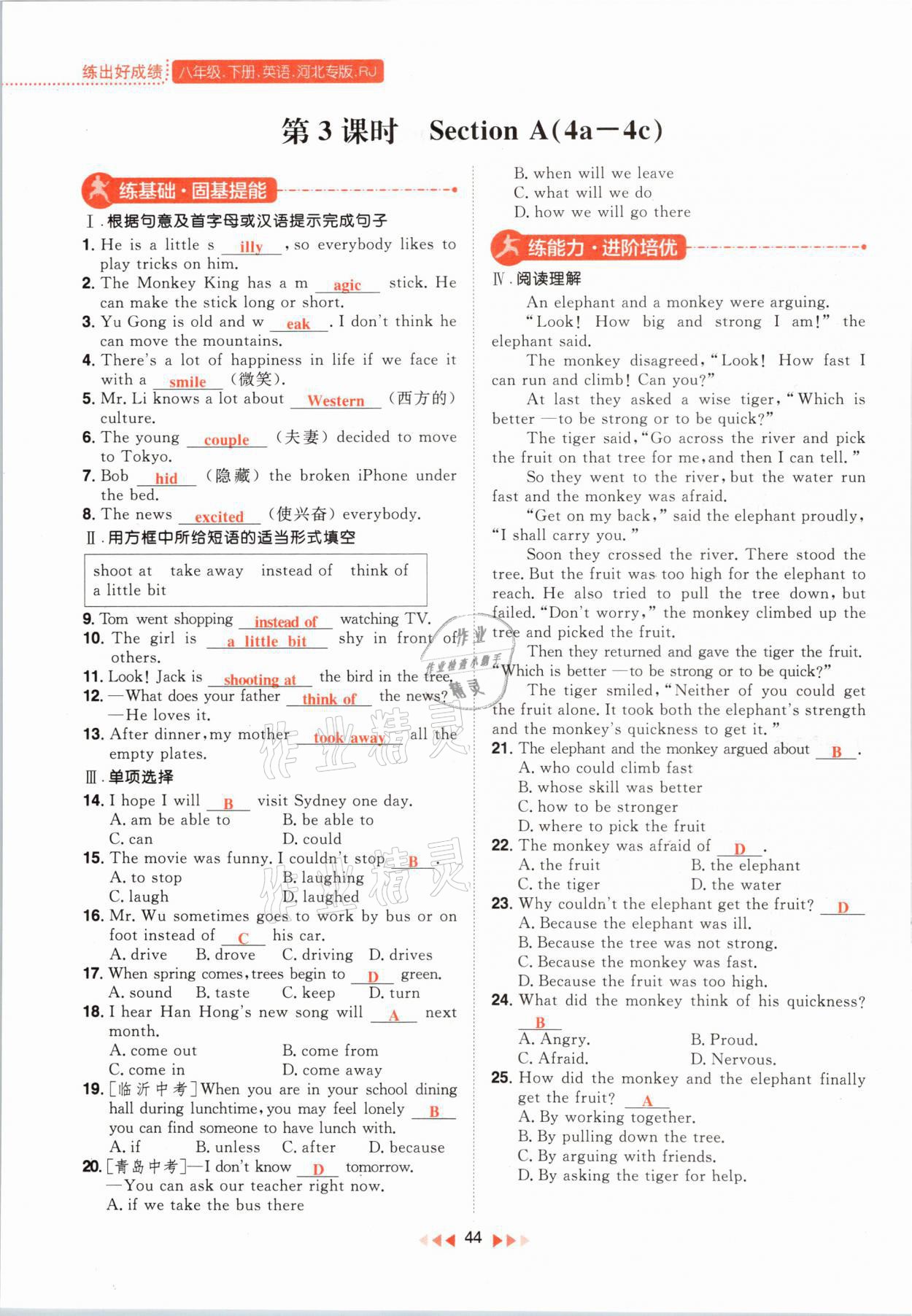 注:目前有些书本章节名称可能整理的还不是很完善,但都是按照顺序排列的,请同学们按照顺序仔细查找。练习册 2021年练出好成绩八年级英语下册人教版河北专版 答案主要是用来给同学们做完题方便对答案用的,请勿直接抄袭。