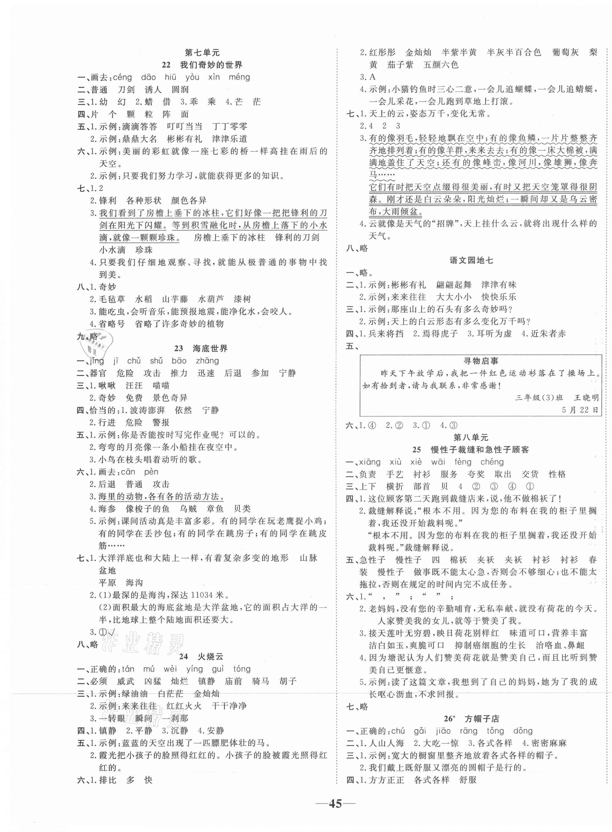 注:目前有些书本章节名称可能整理的还不是很完善,但都是按照顺序排列的,请同学们按照顺序仔细查找。练习册 2021年精彩课堂轻松练三年级语文下册人教版 答案主要是用来给同学们做完题方便对答案用的,请勿直接抄袭。