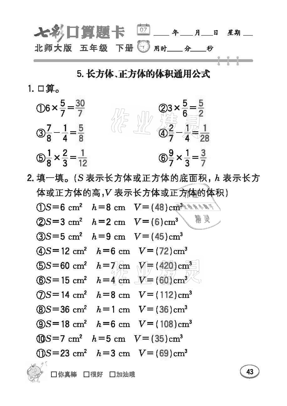 注:目前有些书本章节名称可能整理的还不是很完善,但都是按照顺序排列的,请同学们按照顺序仔细查找。练习册 2021年七彩口算题卡五年级下册北师大版 答案主要是用来给同学们做完题方便对答案用的,请勿直接抄袭。