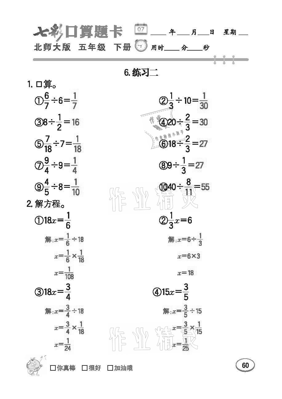 注:目前有些书本章节名称可能整理的还不是很完善,但都是按照顺序排列的,请同学们按照顺序仔细查找。练习册 2021年七彩口算题卡五年级下册北师大版 答案主要是用来给同学们做完题方便对答案用的,请勿直接抄袭。