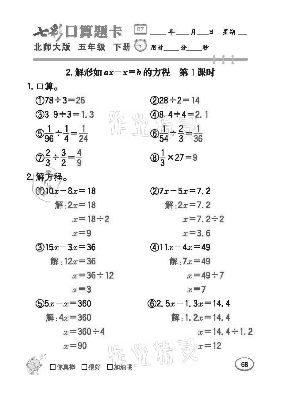 注:目前有些书本章节名称可能整理的还不是很完善,但都是按照顺序排列的,请同学们按照顺序仔细查找。练习册 2021年七彩口算题卡五年级下册北师大版 答案主要是用来给同学们做完题方便对答案用的,请勿直接抄袭。